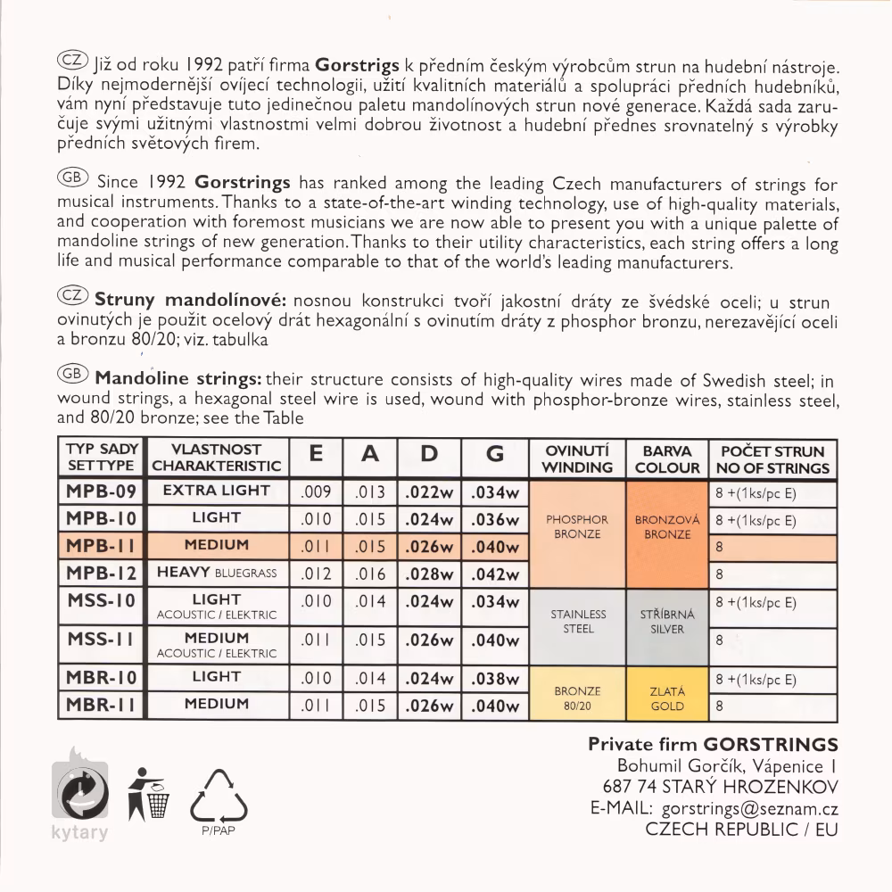 A Gorstrings cseh gyártó mandolinhúrjai első osztályú anyagokból készülnek, és a legjobb cseh mesteremberek keze alól kerültek ki. Alapjuk a prémium minőségű svéd acélból készült hatszögletű mag, amelyet a népszerű foszfor-bronz ötvözettel burkolnak - ez adja a húrok meleg, lekerekített hangját, amely minden fülnek tetszeni fog. A húrokat hurokkal fejezik be a húrhorogra való felakasztáshoz. Adja hangszerének a legjobbat a Gorstrings húrjaival!