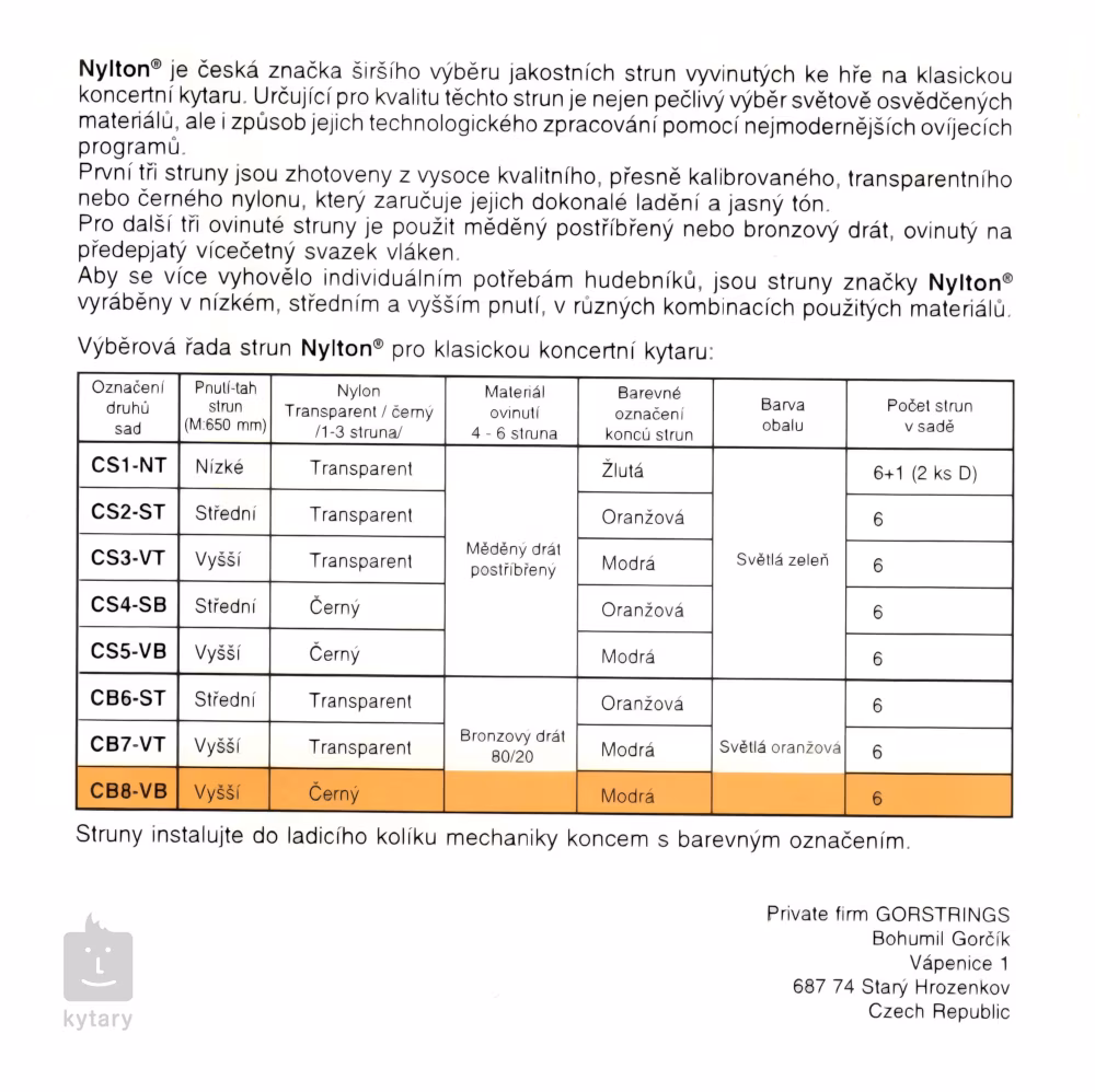 A cseh Gorstrings gyártó Nylton sorozatának klasszikus gitárhoz való neylon húrjai a legmodernebb technológiával, világszerte bevált anyagokból készülnek. Alapjuk egy kiváló minőségű, pontosan kalibrált fekete nejlonmag, amelyet a basszushúroknál népszerű 80/20-as bronzötvözettel burkolnak - ez adja a húrok tiszta, sajátos hangzását, amely tökéletes otthoni gyakorláshoz, koncertezéshez és stúdiófelvételekhez. A húrokat a legjobb cseh kézművesek készítették. Ez a készlet magasabb feszültséget kínál, amely fokozza a hang élességét és tisztaságát.