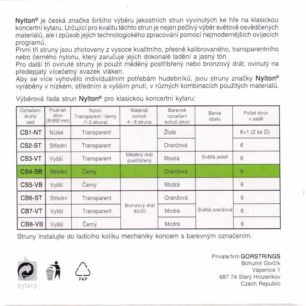 A cseh Gorstrings gyártó Nylton sorozatának klasszikus gitárhoz való neylon húrjai világszinten bevált anyagokból és a legújabb technológia alkalmazásával készülnek. Alapjuk a kiváló minőségű, pontosan kalibrált fekete nejlonmag, amelyet a basszushúroknál népszerű ezüstözött rézzel tekernek körbe - ez meleg, frekvenciakiegyenlített hangzást biztosít a húroknak, amely tökéletes otthoni gyakorláshoz, koncertezéshez és stúdiófelvételekhez. A húrokat a legjobb cseh kézművesek készítették. Ez a készlet közepes feszültséget kínál.