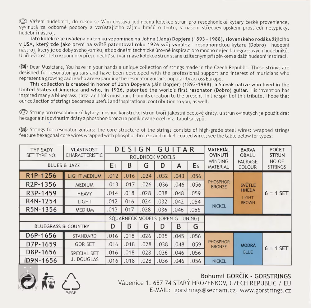 A Gorstrings cseh gyártó reszofonikus húrjai a reszofonikus gitárhoz, más néven rezonátorhoz vagy dobrohoz készültek. A kollekciót John (Jan) Dopjer, az Egyesült Államokban élő szlovák származású John (Jan) Dopjer tiszteletére hozták létre, aki a világon elsőként szabadalmaztatta találmányát, a rezonáns gitárt. Ez a szokatlan hangszer feltalálása óta számos zenészt inspirált, különösen az olyan műfajokban, mint a bluegrass és a blues. A húrok hatszögletű acélmagból készülnek, amelyet a népszerű foszfor-bronz ötvözetbe burkolnak - ez lágyítja és lekerekíti a dobro jellegzetesen szúrós hangját, és a spektrum melegebb oldalán kellemes hangzást kölcsönöz neki. Kényeztesse gitárját a legjobbal a Gorstrings-szel!