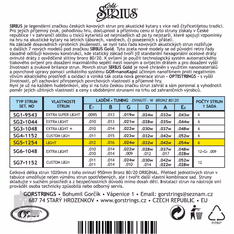 A SIRIUS húrok hosszú hagyományokkal rendelkeznek a cseh piacon, és főként a vándorzenészek és a folkzenészek körében nagyon népszerűek. Nagy vonzerejük nem csupán a kedvező árban rejlik, hanem a kellemes hangzásban és a kényelmes játékban is. Ez az új Sirius Gold sorozat azonban több szempontból is eltér az eredeti Sirius húroktól. A húrok hatlapú magja a népszerű bronzötvözettel (80/20) van tekerve, ennek köszönhetően tiszta, csengő hangzással rendelkeznek, amely minden tábortűznél kiemelkedik. Ezen felül speciális korróziógátló bevonattal vannak ellátva, amely jelentősen meghosszabbítja élettartamukat. Az eredmény egy teljesen új generációs Optistrings húr, amely ragyogó, meleg hangzással, nagy ellenállóképességgel és rendkívül hosszú élettartammal tűnik ki.