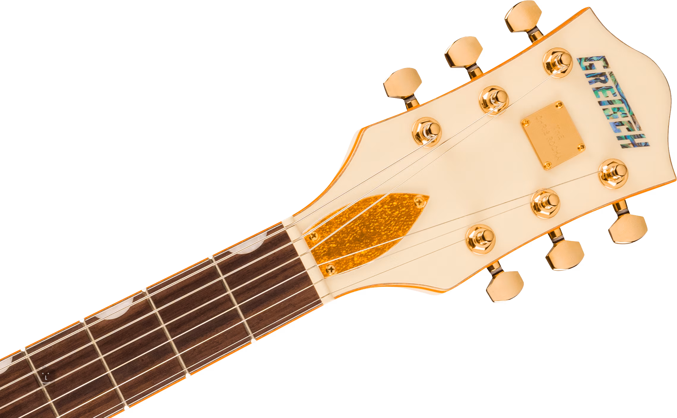 A húrokat a zárható, öntvényből készült hangolókészülékek és az Adjusto-Matic hídon keresztül egy engedélyezett Bigsby B70 tremolo tartja. A Gretsch gitárok klasszikus, szemet gyönyörködtető dizájnját számos stílusos elem emeli ki - a fekete és fehér vonalakkal kiegészített elegáns arany díszítéstől kezdve az arany hardvereken át a Gold Plexi koptatóig.
