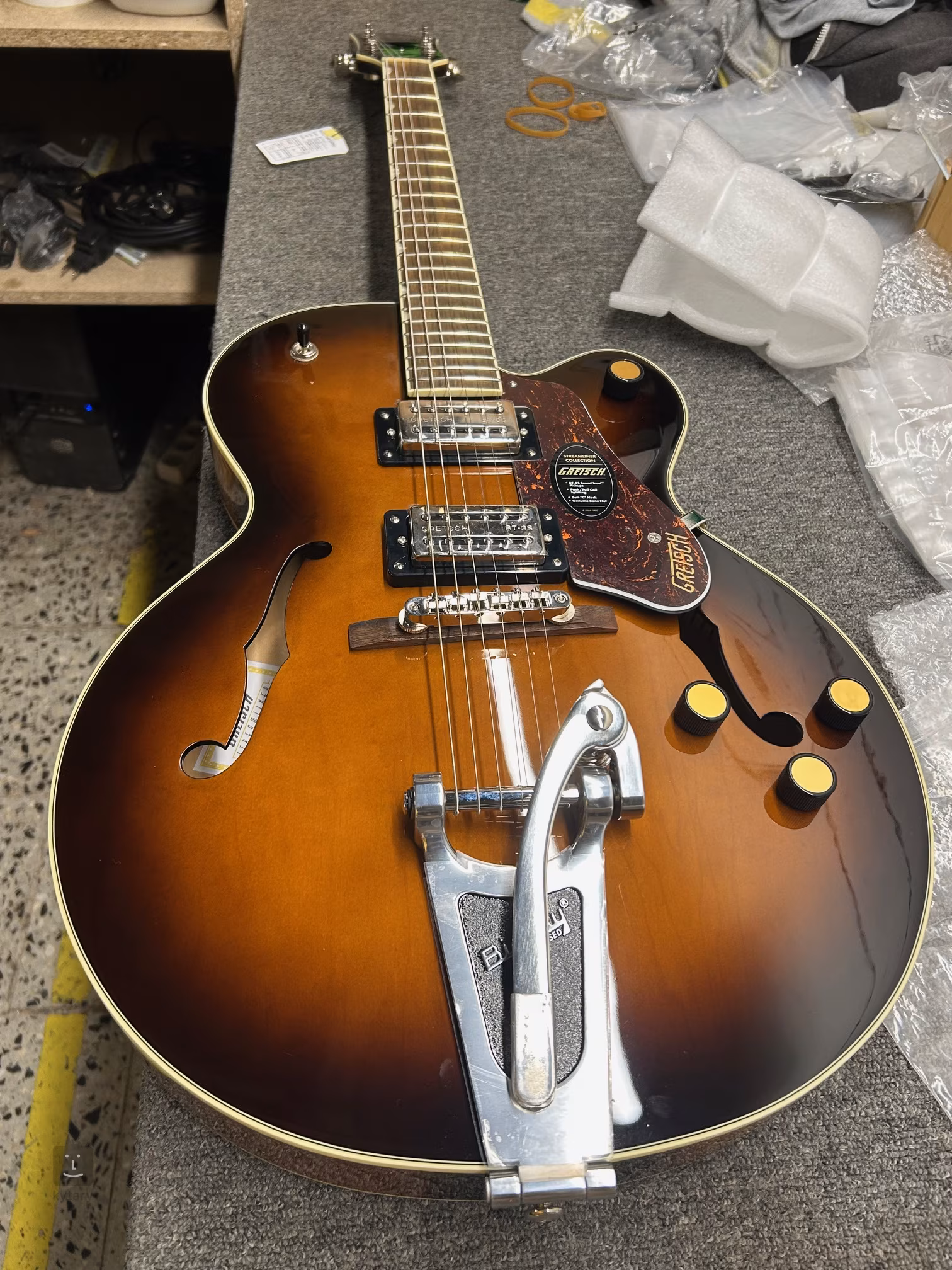 A Streamliner sorozat G2420T gitár biztosan örömet okoz azoknak a zenészeknek, akik modern hangzású és elegáns kialakítású Gretsch gitárt keresnek. A G2420T Streamliner Hollow Body Single-Cut Robusto Burst gitár teste laminált juharfából készült. A „Soft C” profilú nyakhoz egy fügefából készült fogólap van ragasztva, amelyen 22 Medium Jumbo méretű fekvő van. A fogólapon való orientációt megkönnyítik a gyöngyházutánzatból készült (Pearloid Neo-Classic Thumbnail) pozíciójelölők. A Broad'Tron BT-3S humbuckerek magas kimeneti jellel és Alnico 5 és Alnico 2 mágnesek kombinációjával biztosítják a gitárnak a átható középtartományt, szilárd, telített basszust és meleg, tiszta magas hangokat. A hang karakterét két hangerőpotméterrel (minden hangszedőhöz külön), hangszínszabályzóval és push/pull funkcióval ellátott Master Volume vezérlővel állíthatja be. Így egyszerűen szétválaszthatja a hangszedők tekercseit, és a humbucker teljességét single-coil hangzássá változtathatja. A húrok a csontból készült nulladik fekvésen keresztül vannak rögzítve a gyári die-cast mechanikákban, valamint az Adjusto-Matic húrtartón keresztül, amely egy fa alapra van rögzítve a licencelt Bigsby B60 tremolóban. A Gretsch gitárok klasszikus, szemet gyönyörködtető dizájnját számos stílusos elem hangsúlyozza – a boltíves test F-nyílásokkal, az elegáns, finom patinás (Aged White) szegélyek, a „rádió” stílusú potenciométerek, a nikkel hardver és a háromrétegű, teknősbőr utánzatú pickguard arany Gretsch logóval.