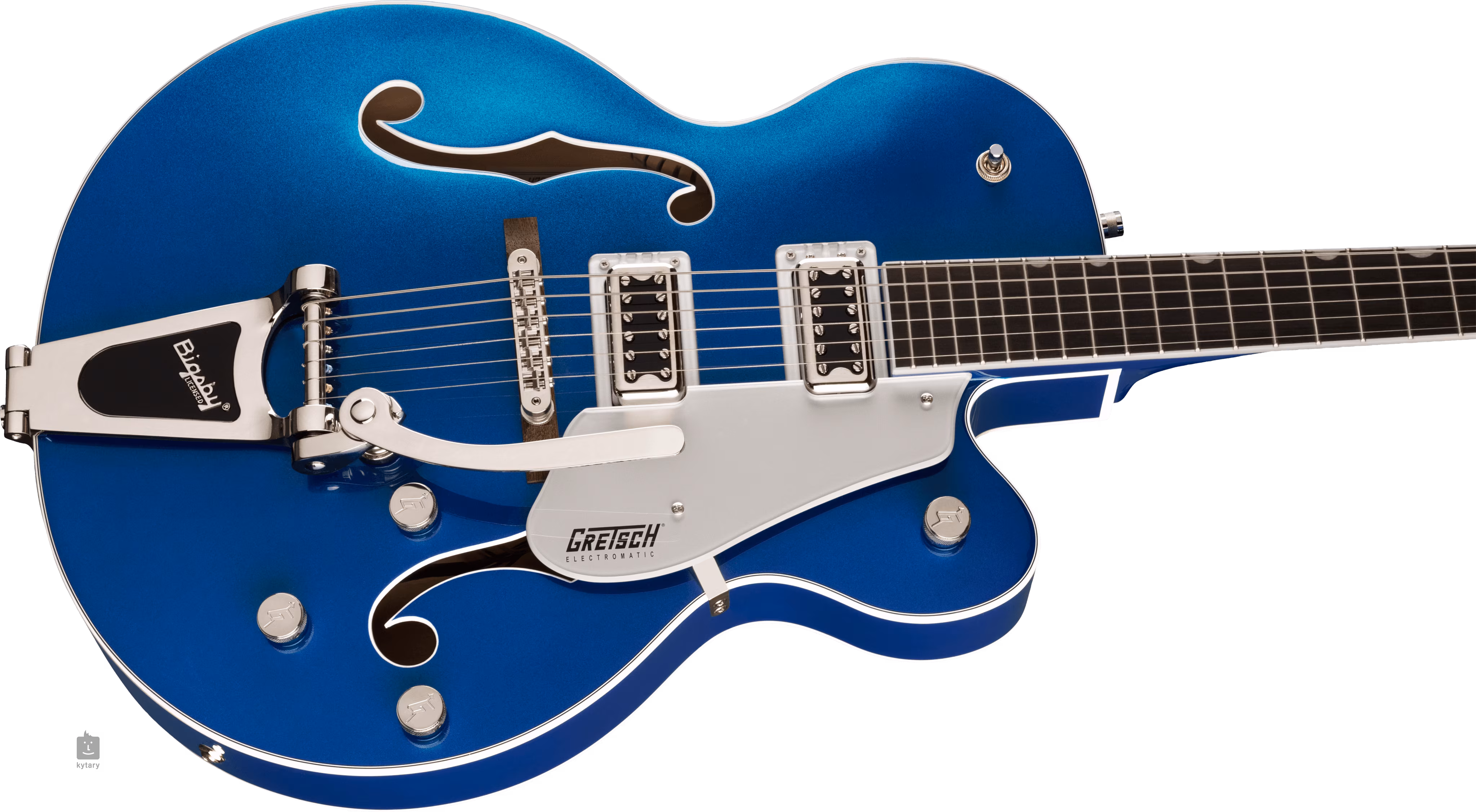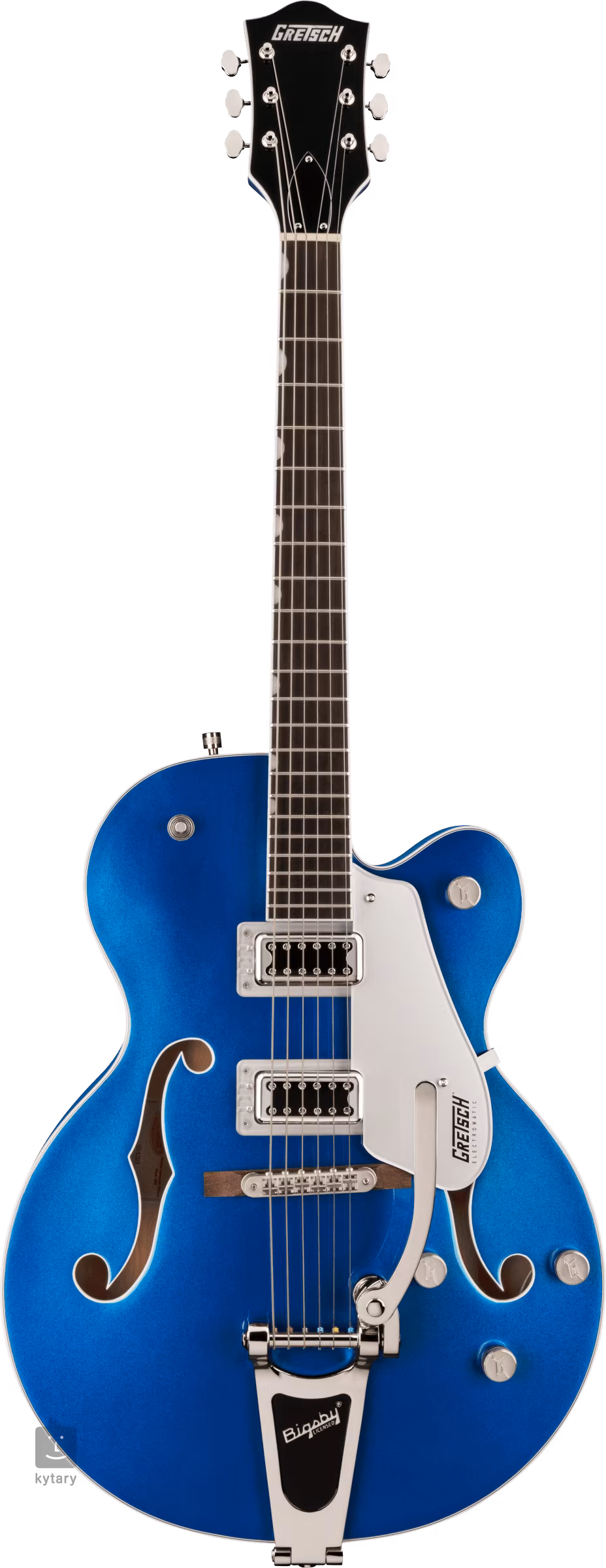 A húrokat egy Graph Tech NuBone nulla bundon keresztül rögzítik a vintage stílusú nyitott hangolókarokban és egy Adjusto-Matic kobozban, amely egy fából készült alapra van szerelve egy engedélyezett Bigsby B60 tremolóban. A gitár stílusos kialakítását az Azure Metallic színösszeállítás, a test és a fejléc kötése, az ezüst plexi koptató fekete Gretsch logóval és a nikkel hardverek emelik ki.