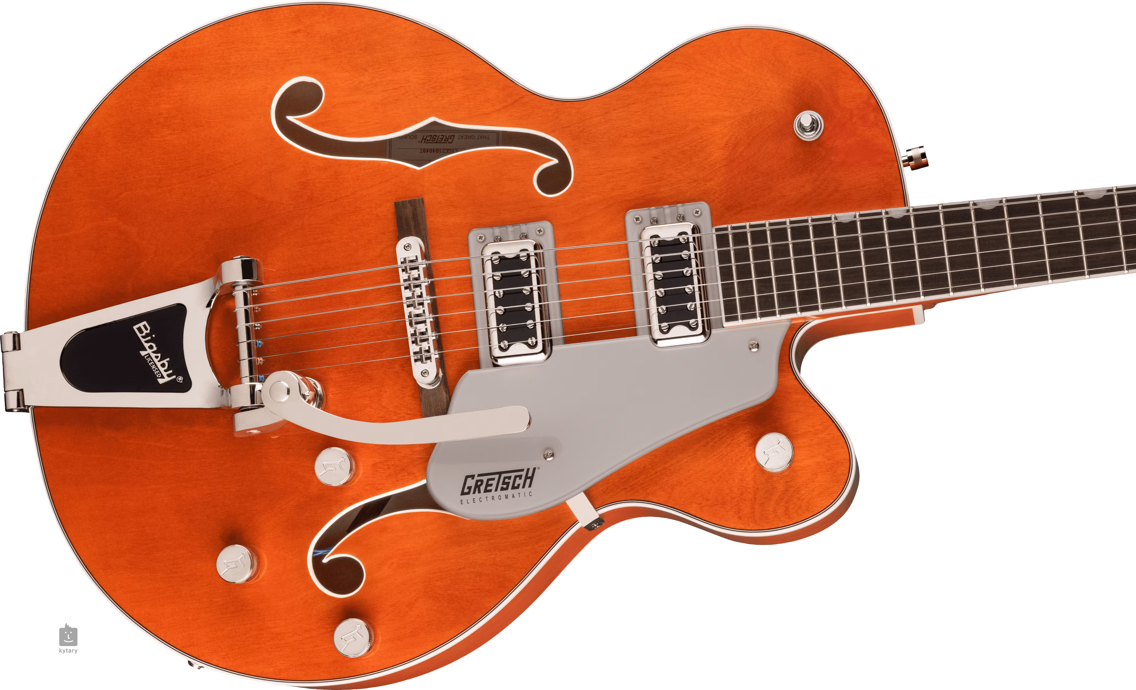 A húrok a Graph Tech NuBone anyagból készült nulladik fekvésen vannak rögzítve a vintage stílusú nyitott hangolókulcsokban és az Adjusto-Matic húrtartón, amely egy fa alapra van rögzítve a licencelt Bigsby B60 tremolóban. A gitár stílusos kialakítását az Orange Stain színű bevonat, a test és a fejlap szegélye, az ezüst Plexi pickguard fekete Gretsch logóval és a nikkel hardver hangsúlyozza.