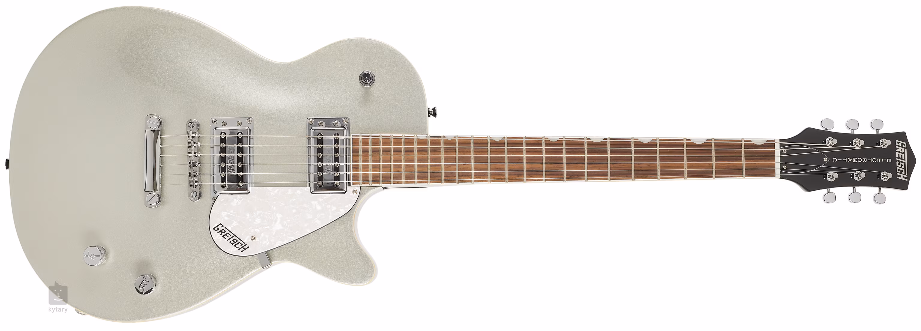 A Gretsch Duo Jet elektromos gitárok single-cut kialakításukkal 1953-tól napjainkig számos híres gitáros és zenei együttes hangzását alakítják. A G5426 Electromatic Jet Club SLV modell a Gretsch Jet gitárok kialakítását, hangzását és érzetét kínálja, széles körben elérhető áron. A kamrás hársfa testet juharfából készült fedlap és fényes ezüst lakkozás díszíti. A juharfából készült nyakhoz paliszander fogólap van ragasztva, amelyen 22 Medium Jumbo méretű fekvő van. A fogólapon való orientációt megkönnyítik a gyöngyház utánzatból készült, eltolt pozíciójelölők (Neo-Classic Thumbnail). A gitár hangját két gyári humbucker biztosítja. A hang kontúrjait a hangerő-szabályzóval, a hangszínszabályzóval és a háromállású hangszedő-kapcsolóval lehet beállítani. A húrok a gyári die-cast mechanikákban, az Adjusto-Matic húrtartóban és a húrtartóban vannak rögzítve. A hangszer stílusos kialakítását a krómozott hardver és a gyöngyház utánzatú pickguard a fekete Gretsch márkajellel hangsúlyozza.