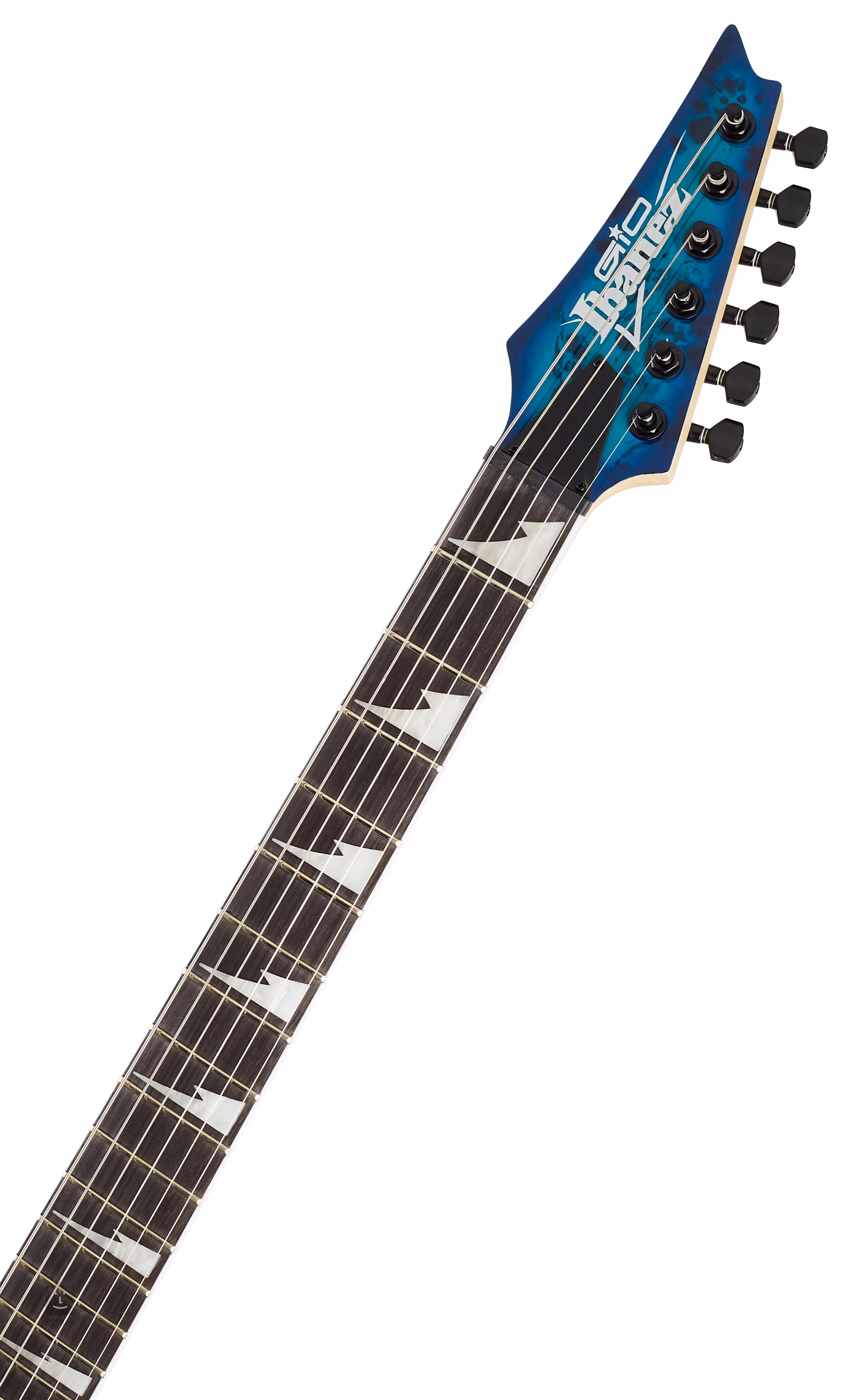 A tömör okoumé testet Aqua Burst fényezés díszíti, amelyet nyárfa gyökérmintázat hangsúlyoz (nem valódi nyárfa furnér). A juhar nyak lilaszív/amarant fogólapra van ragasztva, huszonnégy jumbo bunddal. A gitár tájékozódását a Sharktooth kialakítású, szokatlanul fordított fehér pozíciójelzők segítik.