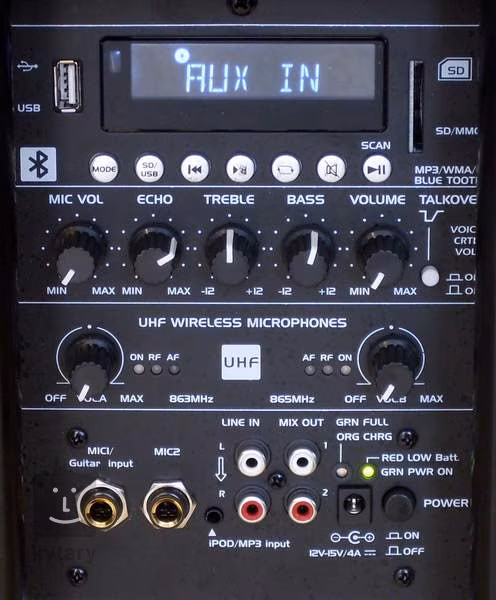 Ez a hordozható hangrendszer akár 800 wattos teljesítményt is kínál. A 15 hüvelykes mélysugárzó a középsugárzóval kombinálva tisztán, tisztán és igazán hangosan adja ki a hangot. Tökéletes karaoke, utcai táncos rendezvények, edzőtermek vagy fitneszklubok számára. A gazdag funkciók közé tartozik a mikrofon- és gitárbemenet, az USB-bemenet, az SD-kártyahely, a Bluetooth és a vonalbemenet, így bármilyen eszközről könnyedén lejátszhatja kedvenc zenéit. A tartozék egy pár vezeték nélküli mikrofon is - egy szabványos kézi és egy headset -, amelyek a 863 és 865 MHz-es UHF-sávnak köszönhetően akár 60 méterre is képesek jeleket továbbítani kültéren és 30 méterre beltéren.