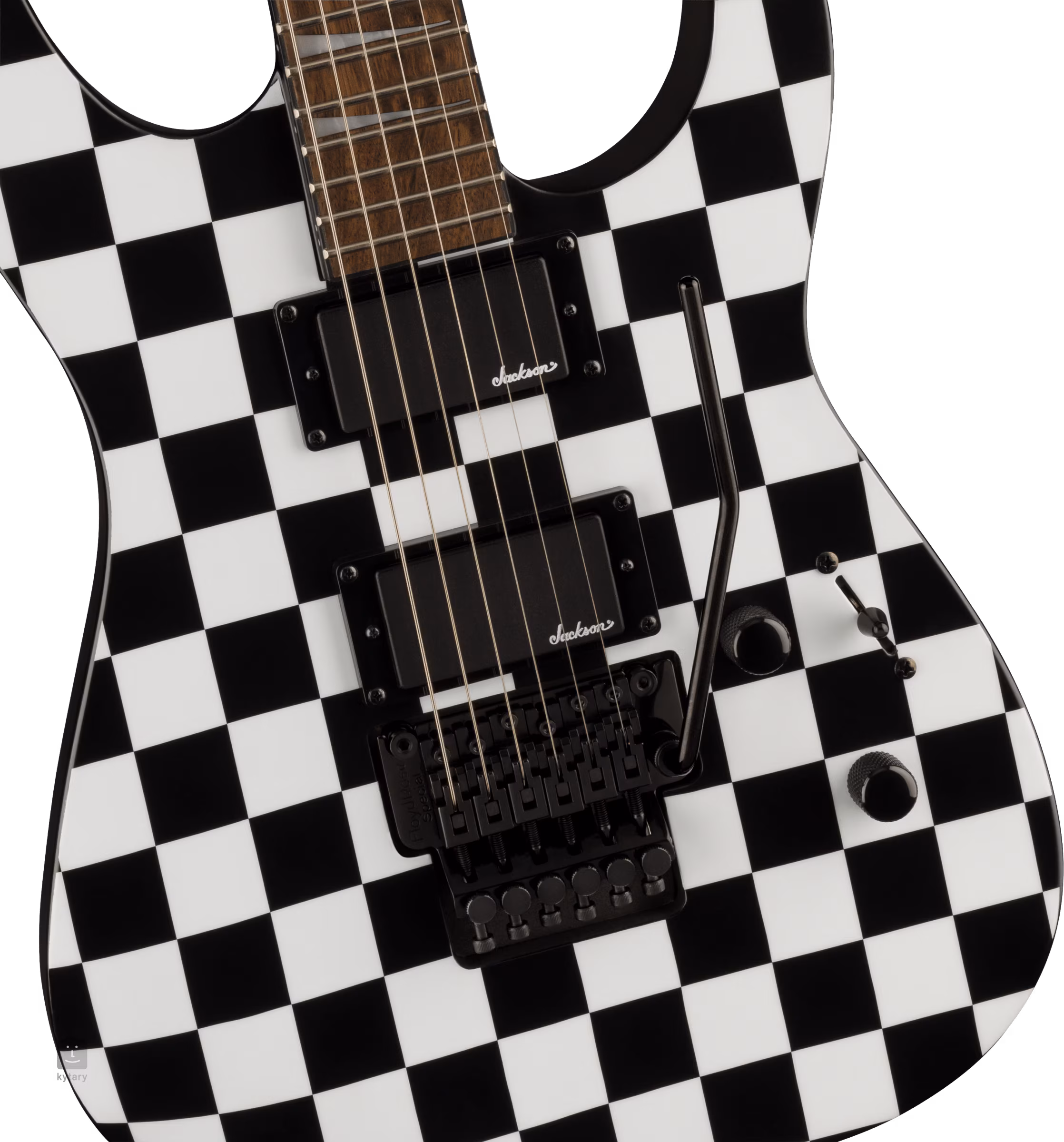 Két saját fejlesztésű humbucker kerámia mágnessel és nagy kimeneti jeladóval adja a gitárnak a metál- és rockzenében oly szükséges szaftos hangzást. A hangerő-potenciométerek, a hangszínszabályozók és a háromállású hangszedő kapcsoló a hangzásbeli beállításokat szolgálják. A húrok a cég die-cast hangológépeiben és egy Floyd Rose Special dupla-reverz tremolóban kaptak helyet, amellyel lenyűgöző hanghatásokat adhatsz a játékodhoz. A hangszer stílusos megjelenését a Checkered Past test és fejléc színösszeállítás és a fekete hardverek hangsúlyozzák.