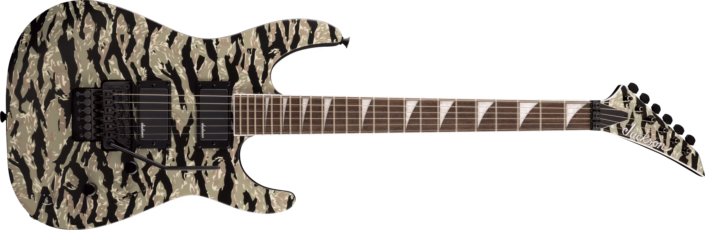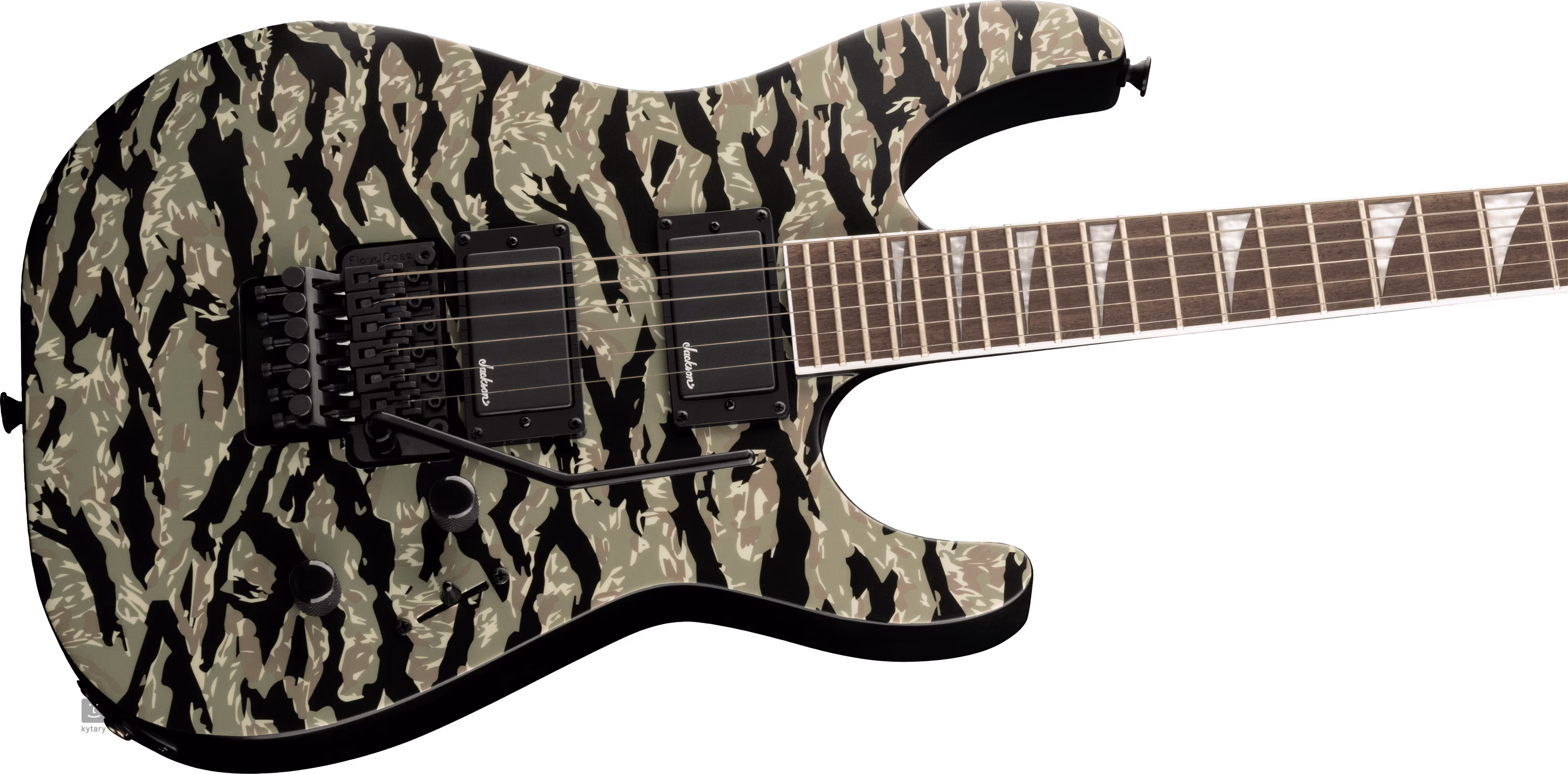 Két saját fejlesztésű, nagy teljesítményű humbucker adja a gitárnak a metál- és rockzenében oly szükséges lédús hangzást. A hangerő-potenciométerek, a hangszínszabályozók és a háromállású hangszedő kapcsoló a hangzásbeli beállításokra szolgálnak. A húrok a cég die-cast hangológépében és egy Floyd Rose Special dupla-reverz tremolóban kaptak helyet, amellyel lenyűgöző hanghatásokat adhatsz a játékodhoz. A szép kivitelezést a terepszínű test kialakítása és a fekete hardverek hangsúlyozzák.