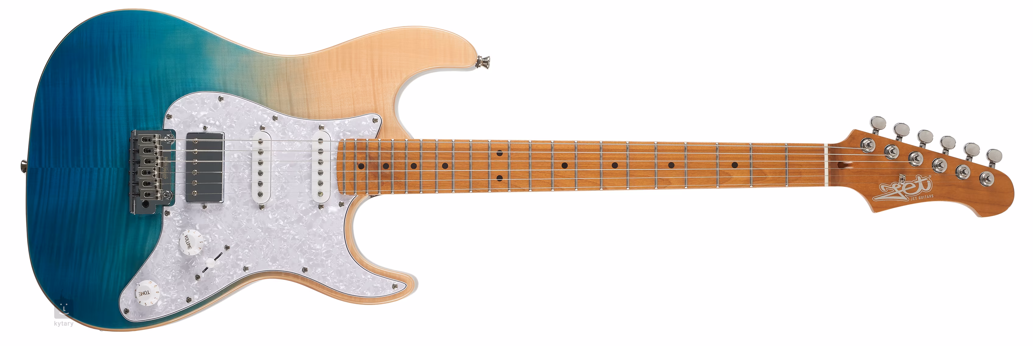 Elektromos gitár JET JS-450 TBL egy modernebb ST/Super ST modell. A hangszer meszes testét látványos furnérozott juhar furnérral díszített, fahánccal, melyet a Transparent Black fényezés támogat. A csavarozott kanadai juhar nyak és fogólap összeszerelés előtt hőkezelésen esett át, ami stabilabbá teszi a fát, miközben egy évek óta játszott nyak/fogólap kinézetét/auráját adja.
