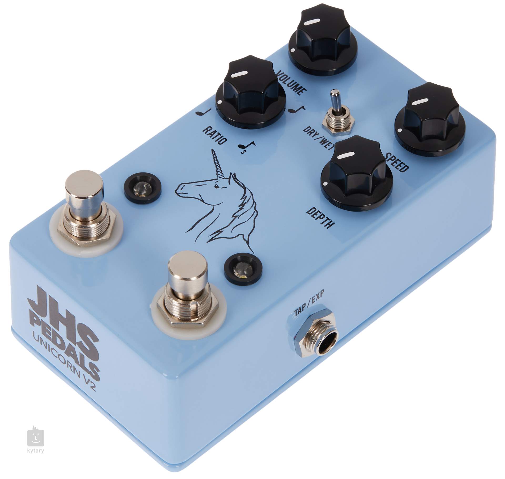 A JHS The Unicorn V2 pedál effektus megragadja a Uni-Vibe effektus varázsát, amely számos híres felvételen hallható (pl. a Pink Floyd Breathe című dalában). A The Unicorn V2 effektben ez a lenyűgöző modulációs effekt, amely phaser és rotary speaker emuláció elemeit tartalmazza, vibrato effektel párosul. A doboz a „tap-tempo” effekt sorozat része, amelyben a Tap Tempo és EXP módok közül választhat – a módtól függően csatlakoztathat külső expressziós pedált vagy tap tempo kontrollert.