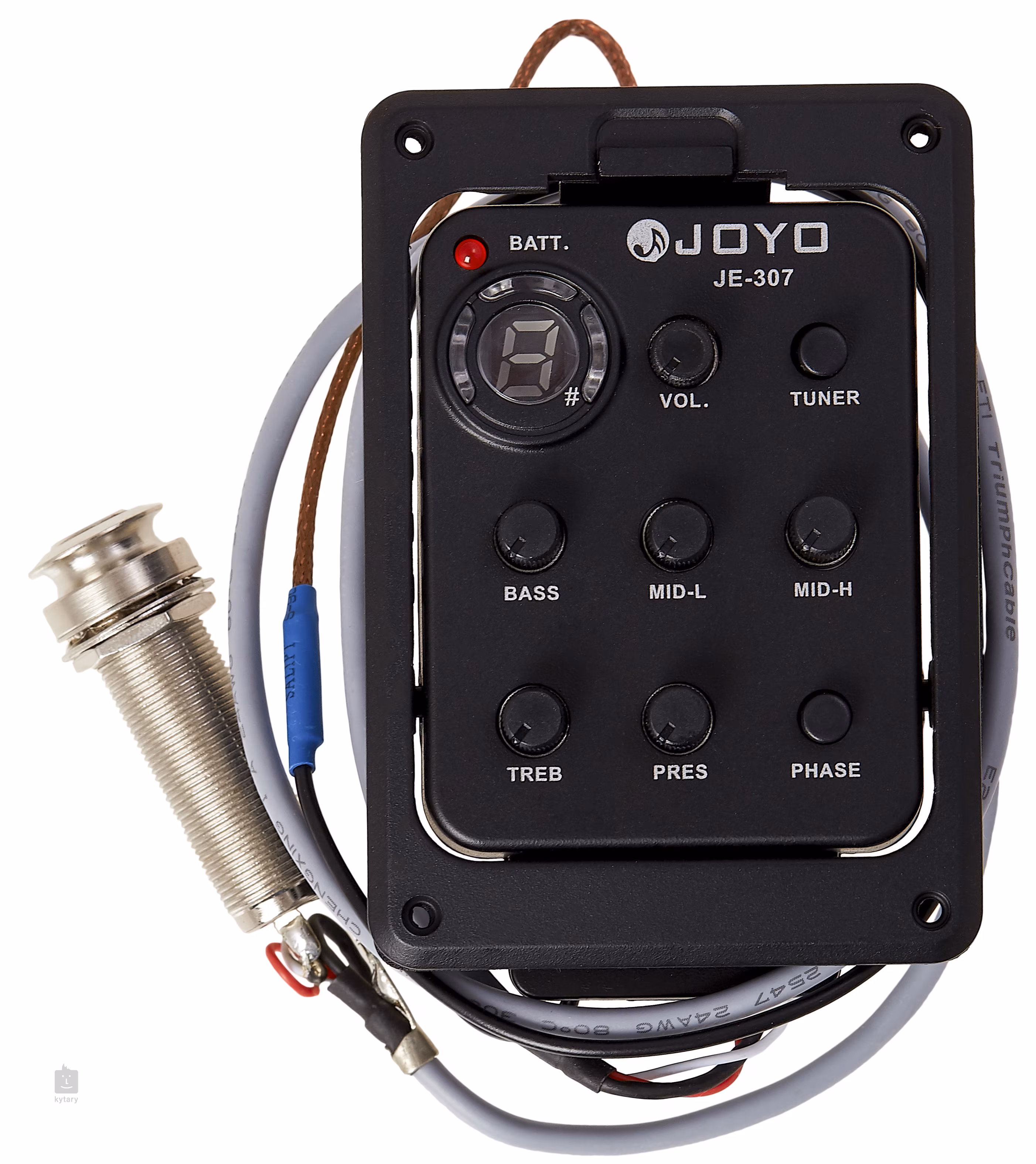 A Joyo JE-307 egy akusztikus gitárhoz alkalmas aktív elektronikai rendszer. A csomagban egy aktív előerősítő található, amelyet a hangszer hátuljába történő beépítésre terveztek, öt sávos equalizerrel, hangerőszabályzóval, fáziskapcsolóval, beépített hangolóval és egyértelmű kijelzővel, az előerősítő hátulján található elemtartóval (9V), piezo hangszedővel, kimeneti csatlakozóval és rögzítőcsavarokkal. Az előerősítő beszereléséhez 62 mm x 46 mm-es kivágás szükséges.