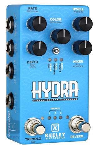 A Keeley Hydra pedál effektje egy sztereó tremoló és reverb, amely a modern Keeley Eccos effekt kialakításán alapul. Háromféle reverb effektet (Spring, Plate, Room) és három vintage stílusú tremolo effektet (Harmonic, Vibrato, Sine) kínál, amelyek hangjait tetszés szerint kombinálhatod, hogy gyönyörű álomszerű ambient felületeket hozz létre - akár elektromos gitárral, basszusgitárral vagy billentyűzettel/szintetizátorral.