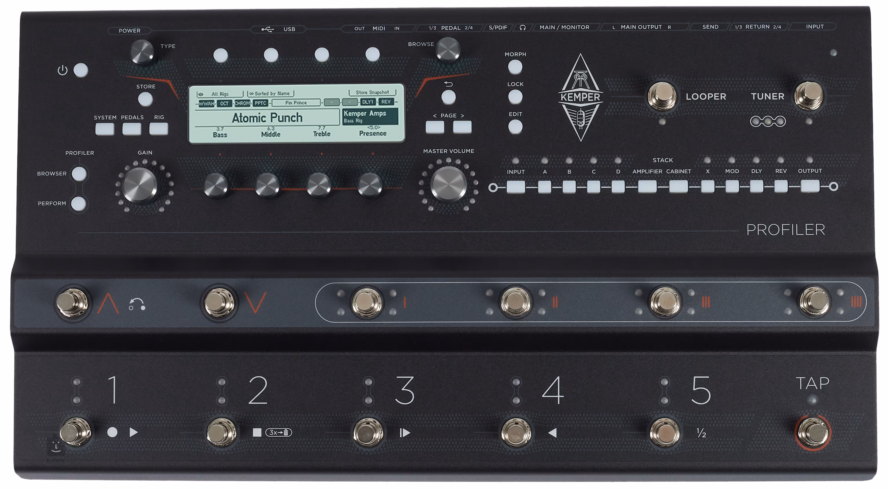 Rugalmas csatlakoztathatóságot is kapott, így a Profiler Stage-et könnyedén integrálhatja a többi felszerelésébe. Találsz egy Instrument bemenetet, négy Return bemenetet, amelyeket effekt hurok vagy Aux In-ként használhatsz, két Send kimenetet és egy S/PDIF digitális csatlakozót a digitális jelátvitelhez. Van még egy pár Main kimenet sztereó összeköttetésekhez és egy pár Monitor kimenet, négy kimenet külső lábkapcsolók és expressziós pedálok számára, valamint egy fejhallgató kimenet. A MIDI-csatlakozás és két USB-port is rendelkezésre áll a biztonsági mentésekhez, firmware-frissítésekhez vagy a dedikált Rig Manager szoftverhez való csatlakozáshoz, ahol hangokat szerkeszthet, paramétereket állíthat be és hangok szervezett könyvtárát hozhatja létre. Álmai hangjának megalkotása még sosem volt ilyen egyszerű.