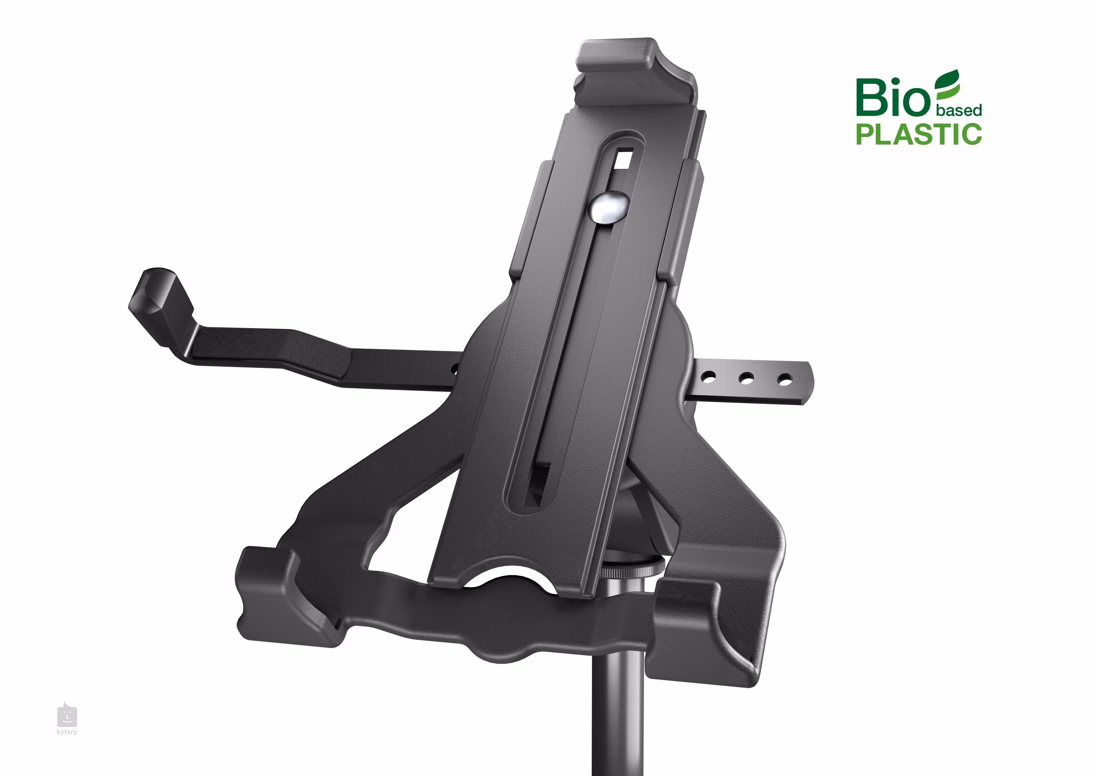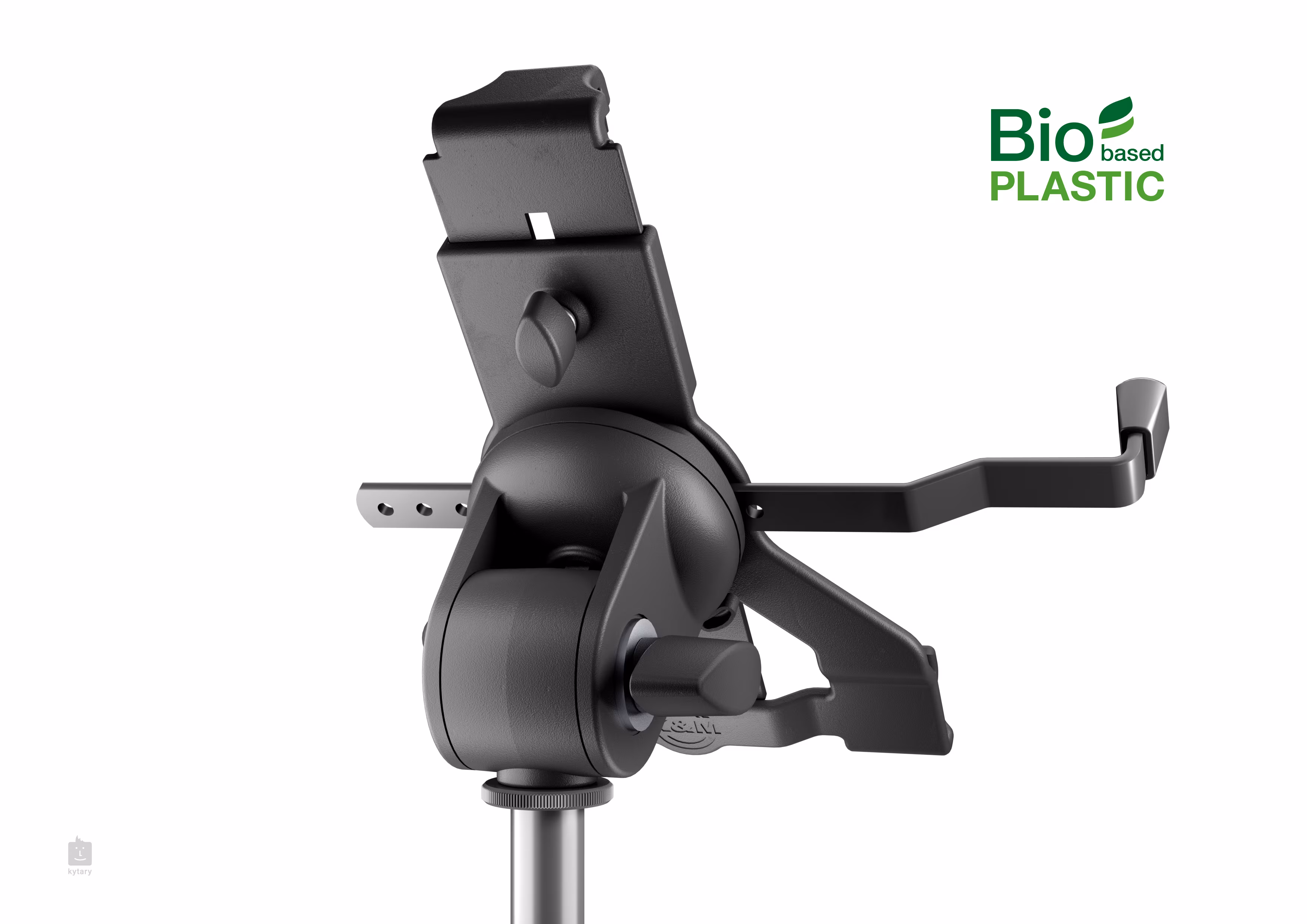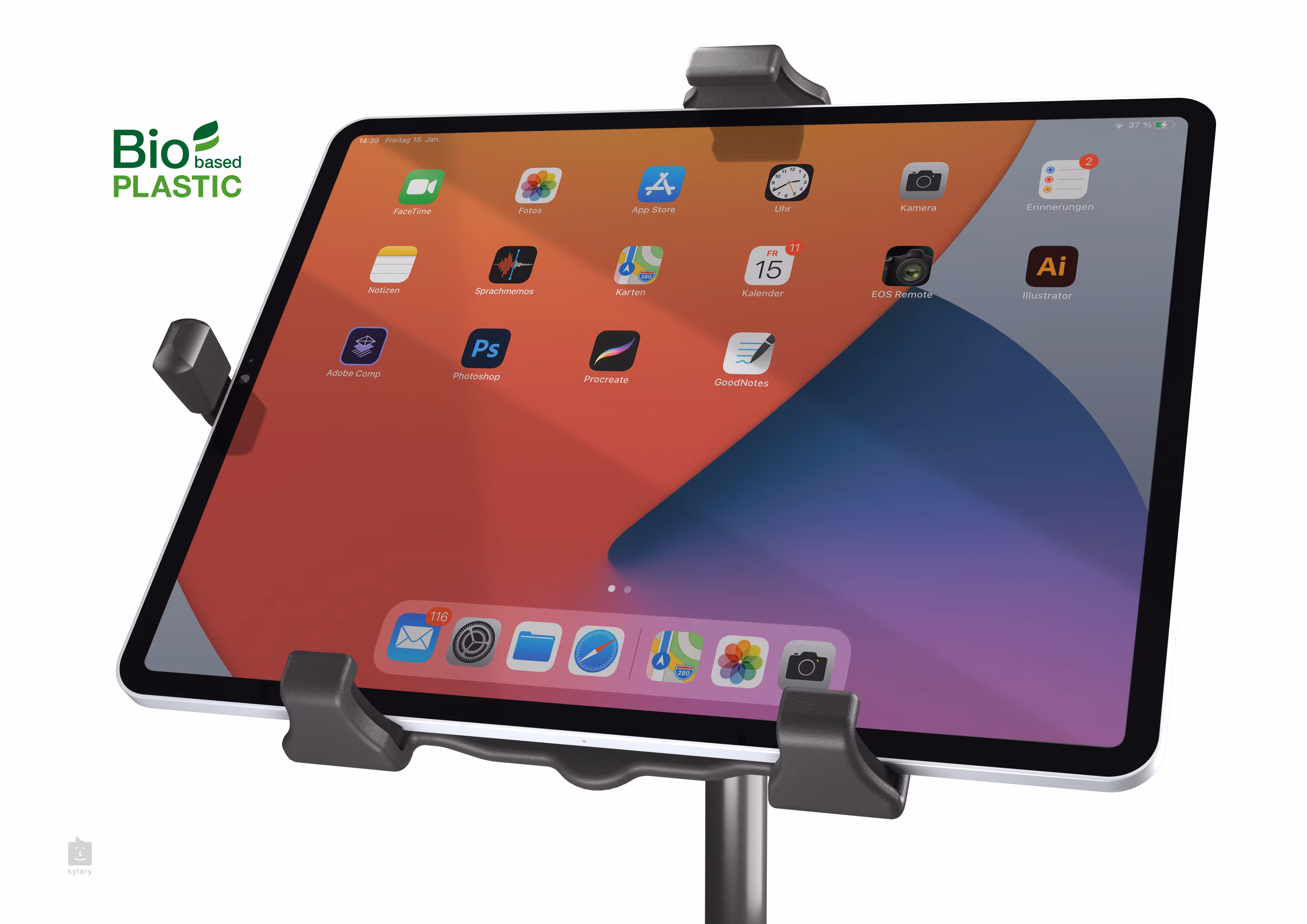 Univerzális táblagéptartó praktikus zárrendszerrel a készülék maximális biztonsága érdekében és állítható magasságú állvánnyal. Az újrahasznosított műanyag és acél kombinációjából készült tartó nagyszerű rezgéscsillapító tulajdonságokkal is rendelkezik, így nemcsak stúdiómunkák során, hanem hangos élő fellépések során is használható. A tartó 10-16 hüvelykes méretű táblagépekhez alkalmas. A tartó magassága 158-280 mm között állítható, szélessége pedig 150-330 mm között állítható.