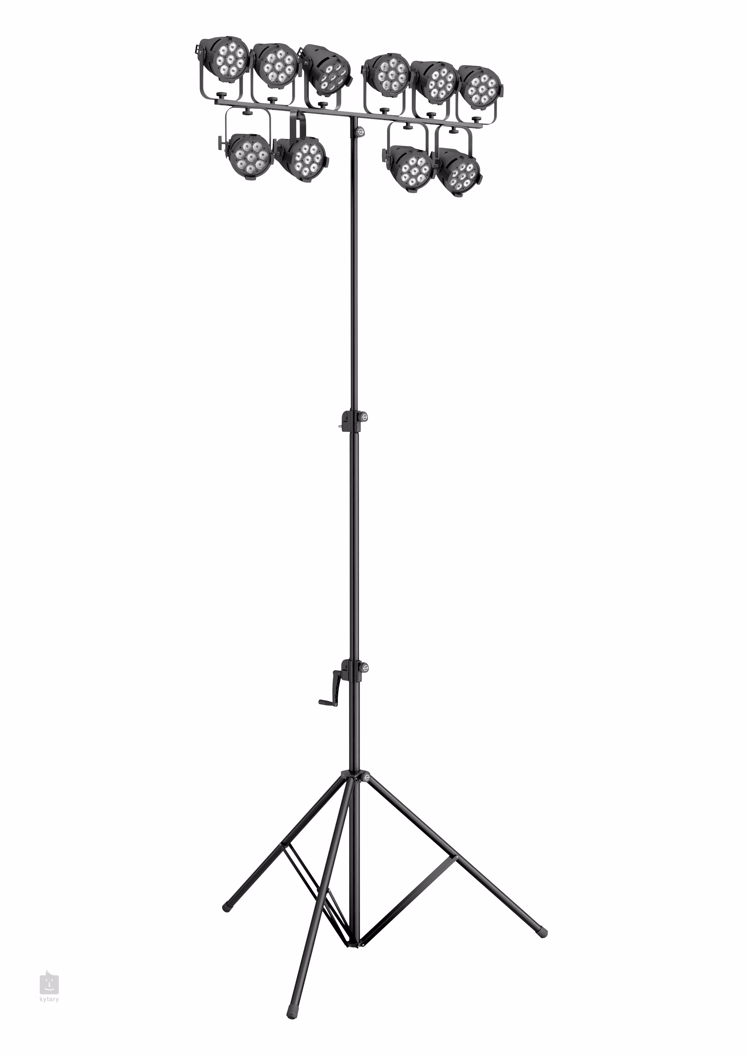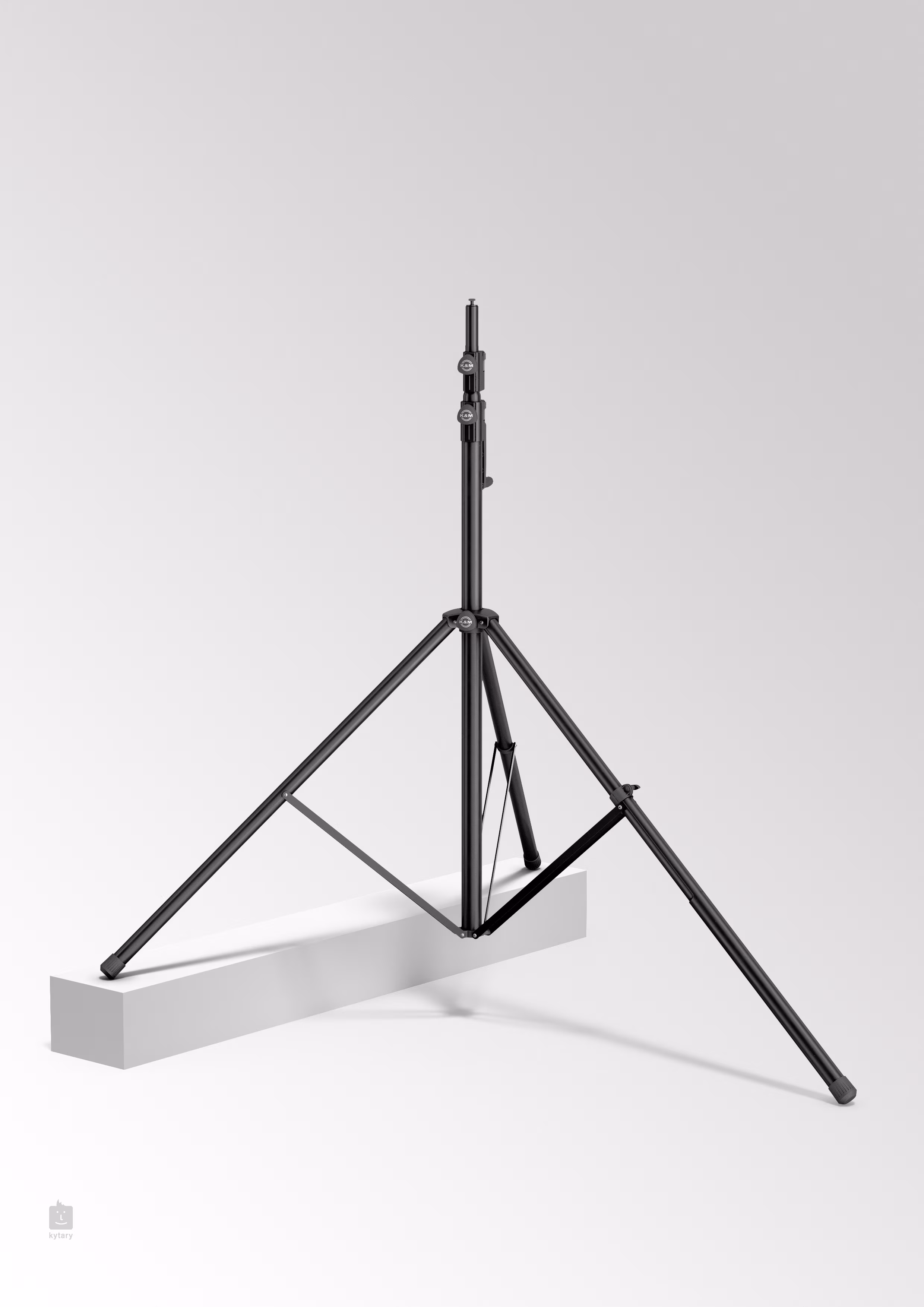 Az állvány könnyű alumíniumból készült, és rugalmas háromlábú talppal rendelkezik, amely még egyenetlen felületeken is kivételes stabilitást biztosít. A 40 kg-os maximális teherbírással ez az állvány olyan igényes alkalmazásokhoz való, ahol nehéz gépeket vagy nagy mennyiségű berendezést kell felszerelni. Az állvány rúdjának átmérője 35 mm, ami lehetővé teszi hangszórók vagy más, 36 mm-es fészkekkel rendelkező eszközök rögzítését. Emellett beépített M10-es menettel rendelkezik a különböző keresztrudak rögzítéséhez a lámpák felakasztásához. Az állványhoz megvásárolható egy szintező láb, amely lehetővé teszi, hogy egyenetlen felületeken is kiegyensúlyozott és stabil szerkezetet érjen el. A könnyű szállításhoz egy párnázott szállítótáska is kapható.
