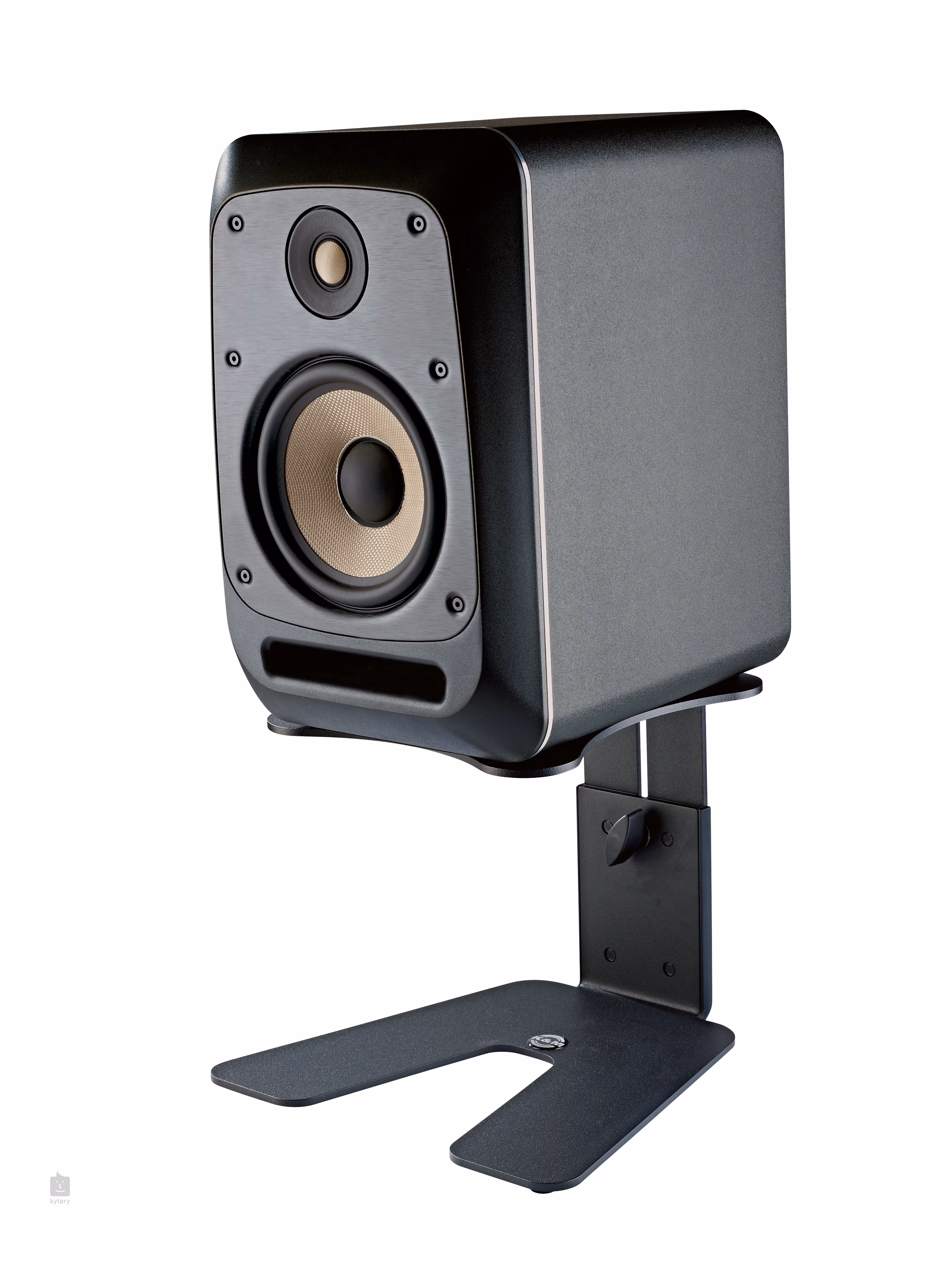 Elegáns stúdiómonitor állvány tartós acélból. Az alsó perem négy gumírozott lábbal rendelkezik a maximális stabilitás és a kiváló rezgéscsillapítás érdekében. Az állvány magasságállítással is rendelkezik az optimális használat és a részletes megfigyelés érdekében.