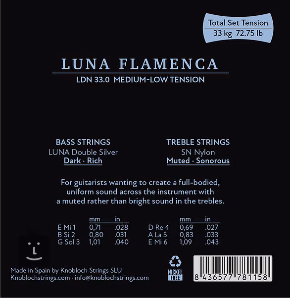 A KnoblochLUNA FLAMENCA flamencohúrok kivételesen magas minőségű klasszikus gitárhúrok, amelyeket kifejezetten flamencójátékosok számára terveztek. A dupla ezüst Luna basszushúrok erőteljes, mély hangzása titokzatos atmoszférát teremt, míg az SN nejlonból készült, magas, tekercs nélküli húrok tompák és gazdagok. Az eredmény tompított, sötétebb hangkarakterű húrok, amelyek tökéletesen illeszkednek ahhoz a stílushoz, amelyhez készültek.