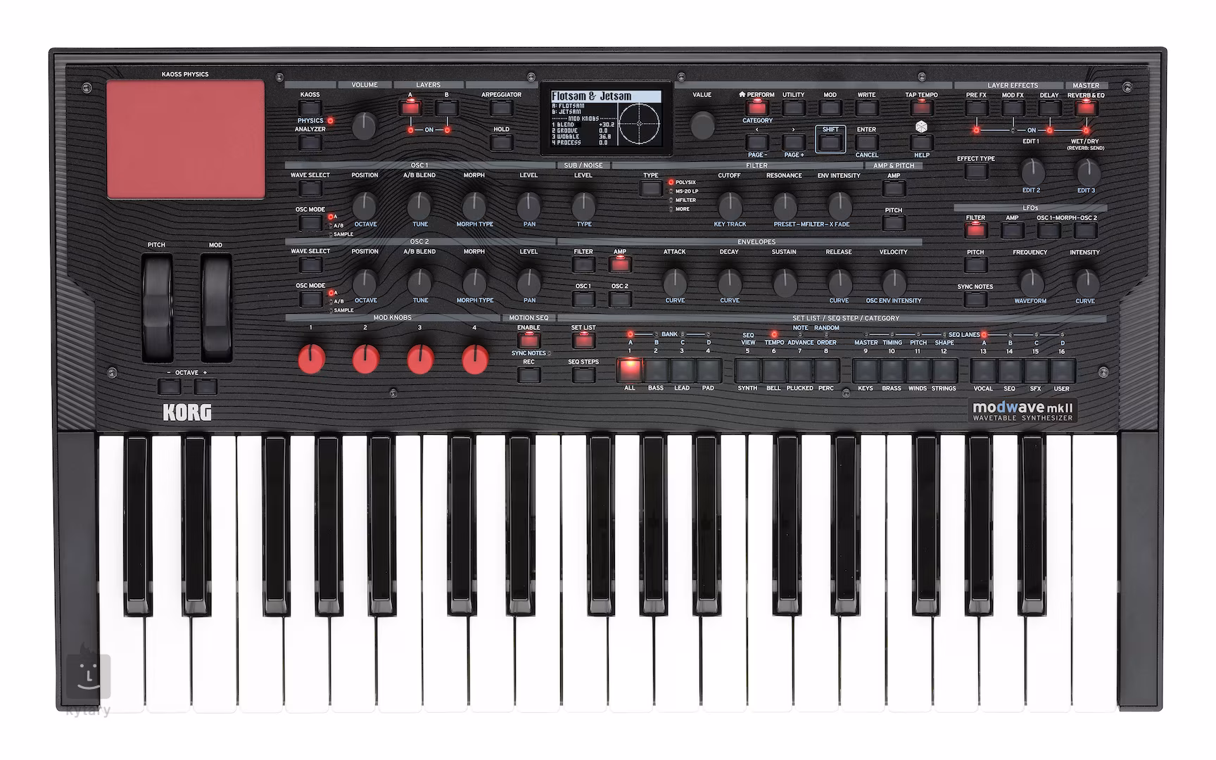 A Korg Modwave MKII egy csúcskategóriás wavetable szintetizátor, amely egy klasszikus hangzás modern újraértelmezését kínálja, amelynek gyökerei 1985-ig nyúlnak vissza. Újonnan olyan alapvető funkciókkal bővül, mint a Kaoss Physics és a Motion Sequencing 2.0, és elődjéhez képest majdnem kétszeres polifóniát, kibővített LFO-kat és még sok mást kap.