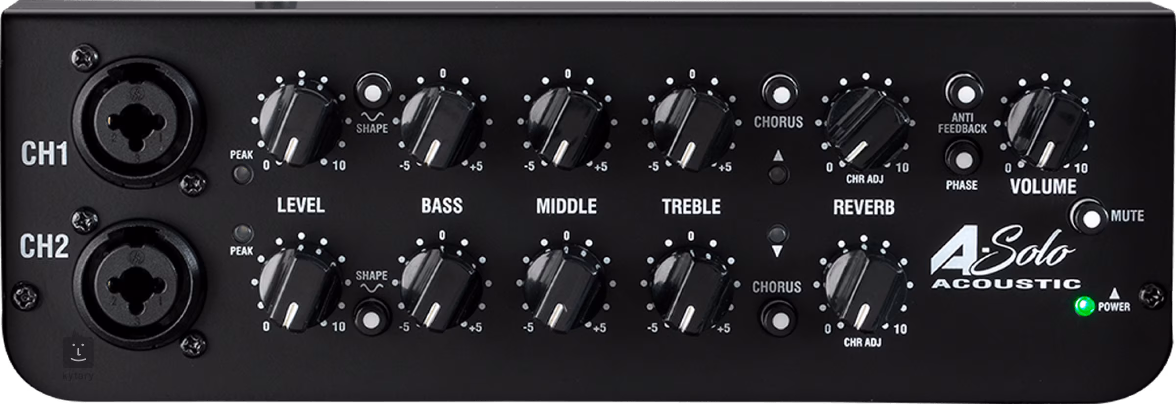 A nagy teljesítményű Class D erősítő és a szélessávú 8 hüvelykes hangszóró teljesen kompenzálja a készülék kisebb méreteit, és kellemesen tiszta hangzással biztosít elegendő meghajtást. A főpanelen minden csatornához külön vezérlők találhatók: háromsávos ekvalizer, Shape gomb a hang tisztázásához, azaz a magas hangok kiemeléséhez, Level vezérlők a bemeneti jelszint beállításához, beépített Reverb és Chorus effektek (a Reverb vezérlőkkel mindkét effekt szintje beállítható) és közös Master Volume vezérlő. Örömteli praktikus funkciók az Anti-Feedback visszacsatolás-csökkentéshez (amely gyakori jelenség a hangszeres akusztikus hangszerek hangosításánál), a Phase fázisfordításhoz vagy a Mute opcióhoz, amellyel mindkét csatorna jelét elnémíthatja (nem a vonali bemenetet és az effekt hurkot).