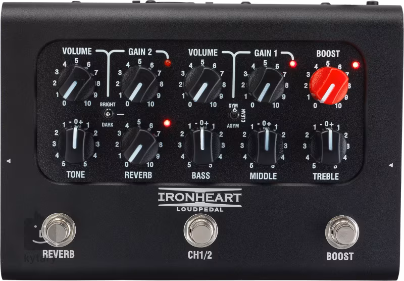 3x FS (Reverb, CH 1/2, Boost); CH1: Volume, Gain, Gain character switch (Clean, Sym, Asym); CH2: Volume, Gain, Tone switch (Bright, Dark, Flat); Boost, Tone, Reverb, Bass, Middle, Treble