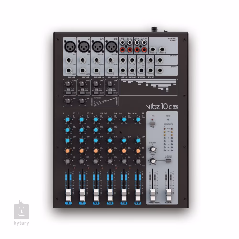 A VIBZ 10 ideális megoldás kiszenekari és rendezvényhangosításhoz. Négy csatornát kínál szimmetrikus mikrofon/line bemenetekkel, háromsávos korrekcióval, fantomtáppal és low cut szűrővel, két inzertet külső effektek használatához vagy két sztereó/mono csatornát kétsávos korrekcióval.
