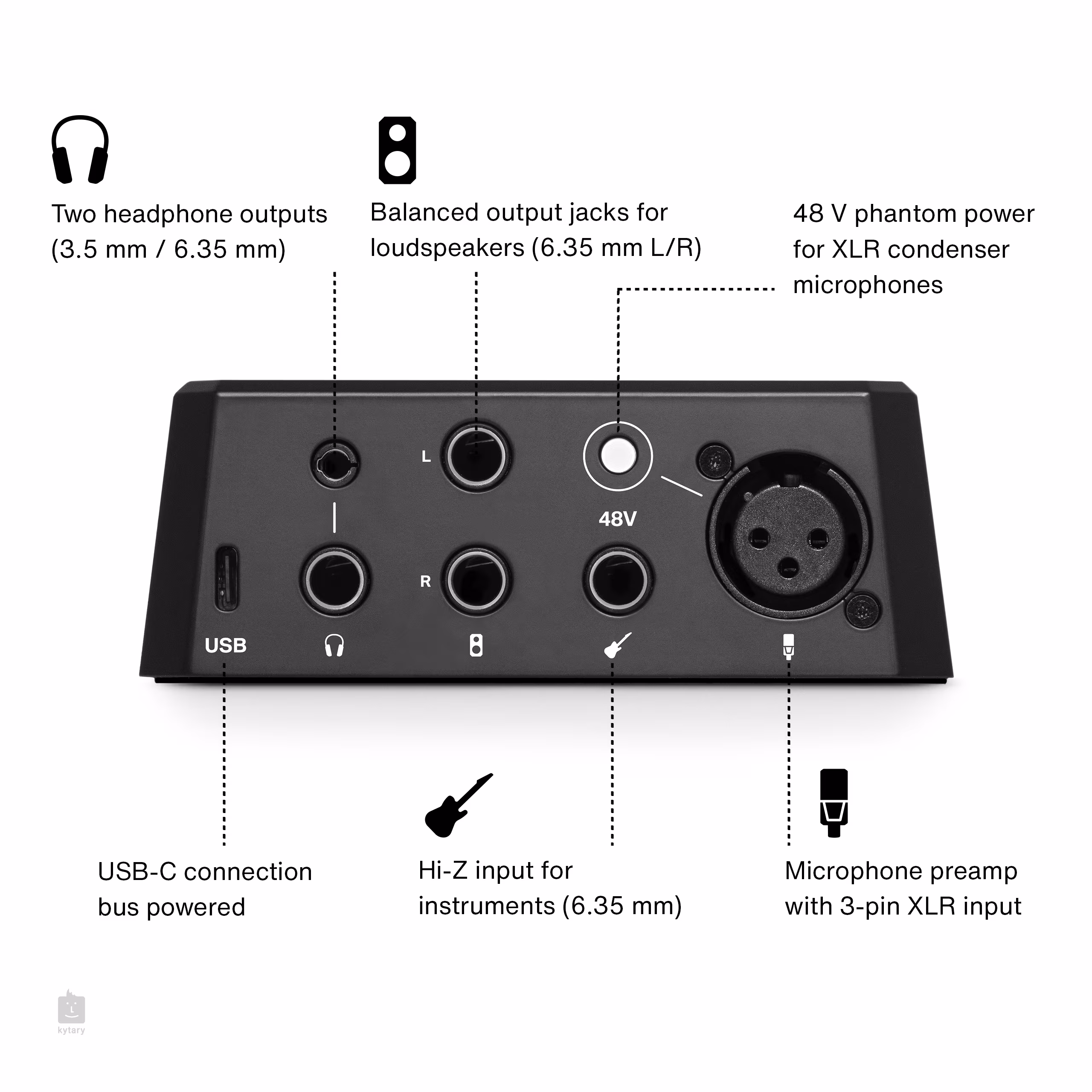 1x XLR (mic), 1x Jack 6.3 mm (HiZ)