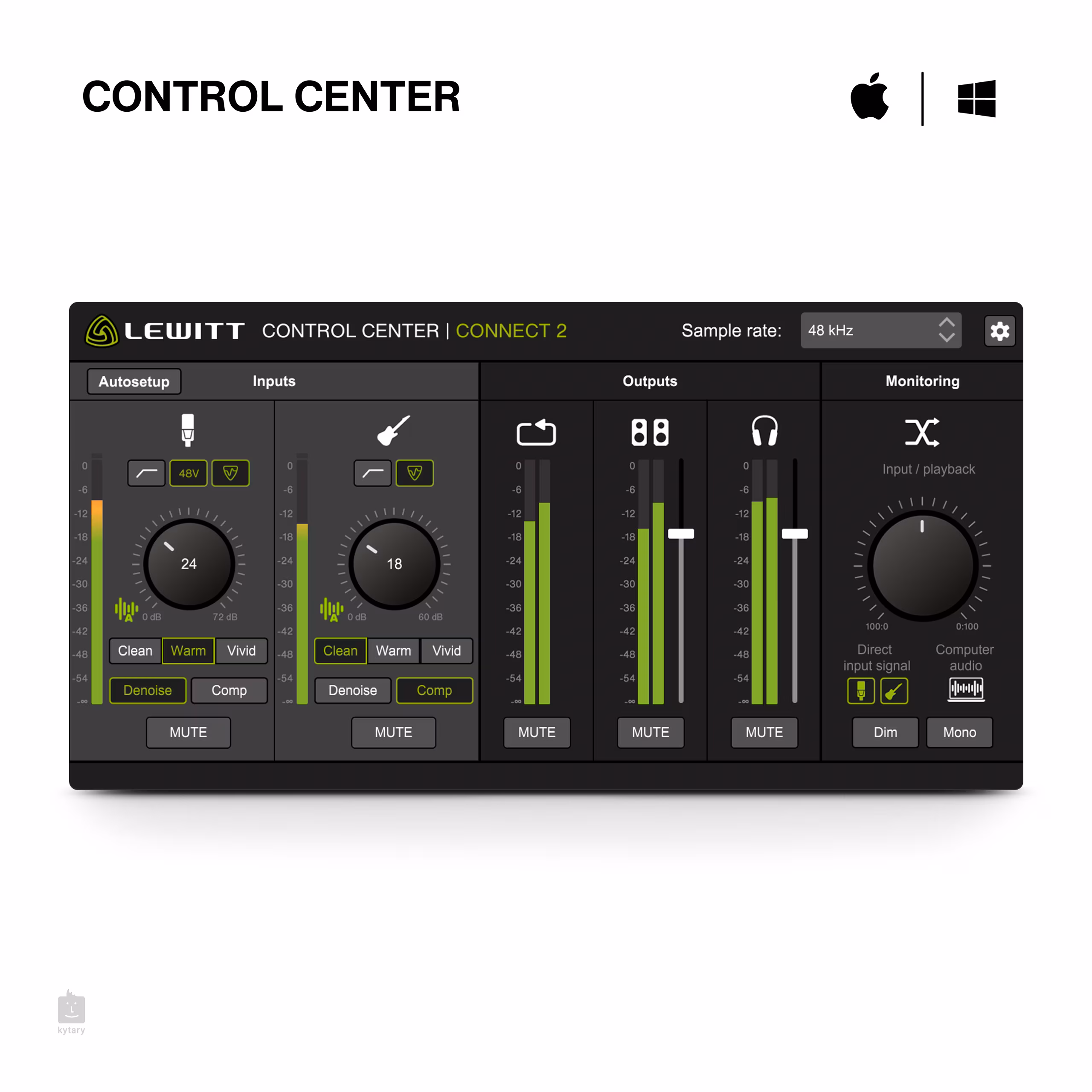 A Lewitt CONNECT 2 egy kompakt USB-C hangkártya, amely nagyon felhasználóbarát, és még azokat is kiszolgálja, akik csak most kezdik a hangrögzítést. Intuitív érintésvezérlést és áttekinthető virtuális Control Centert kínál, amelyben könnyű navigálni. Ne vesztegesse az idejét hosszadalmas beállítási folyamatra. Az Autosetup funkció néhány kattintással beállítja az optimális paramétereket az Ön számára - a Clipguard, a Denoiser és a Compressor segítségével megvédi a felvételét a túlhajtástól és a nem kívánt környezeti zajoktól, így pillanatok alatt tiszta, kiegyensúlyozott hangzást kap.
