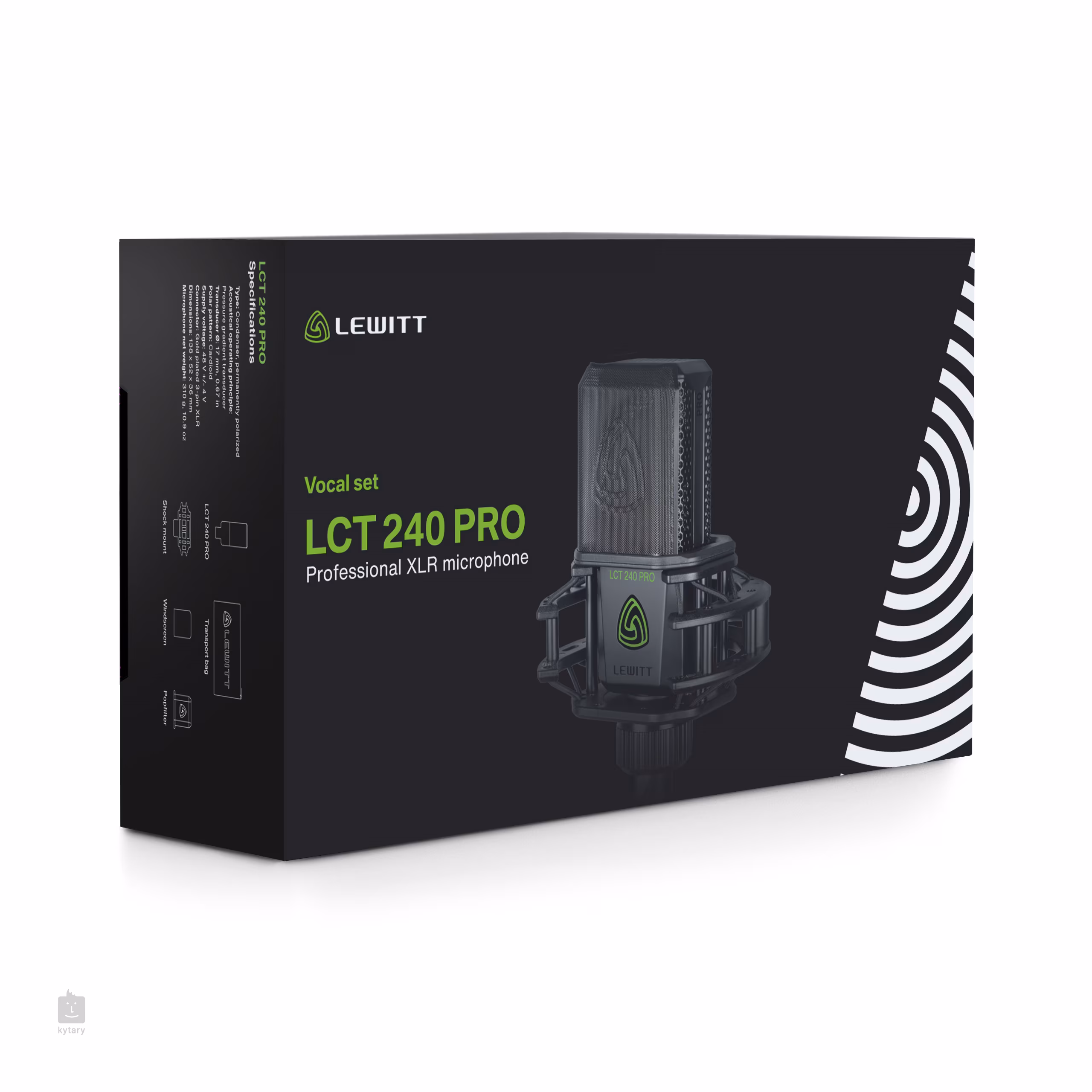 A csomag tartalma Vocal Set - Lewitt LCT 240 mikrofon - Felfüggesztett, ütésálló mikrofontartó (pók) - Finom mágneses popszűrő (filmezéshez is alkalmas - nem takarja el a mikrofon mögötti arcot) - szélálló habszivacs védelem - hordtáska