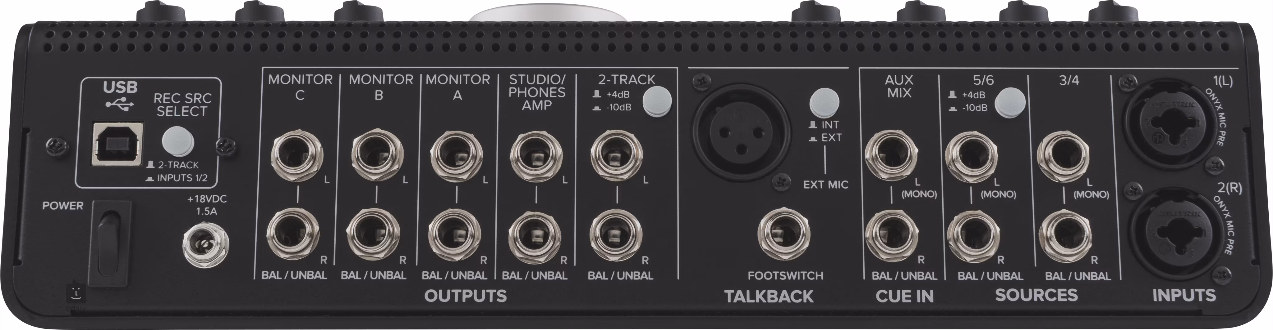 Válasszon három jel és két pár stúdiómonitor között. Közvetlenül az előlapon található egy 3,5 mm-es bemenet telefonok és táblagépek csatlakoztatásához és két fejhallgató kimenet. Minden bemenet és kimenet saját erősítés/hangerőszabályzóval rendelkezik, valamint Mono, Mute és Dim vezérlőkkel.