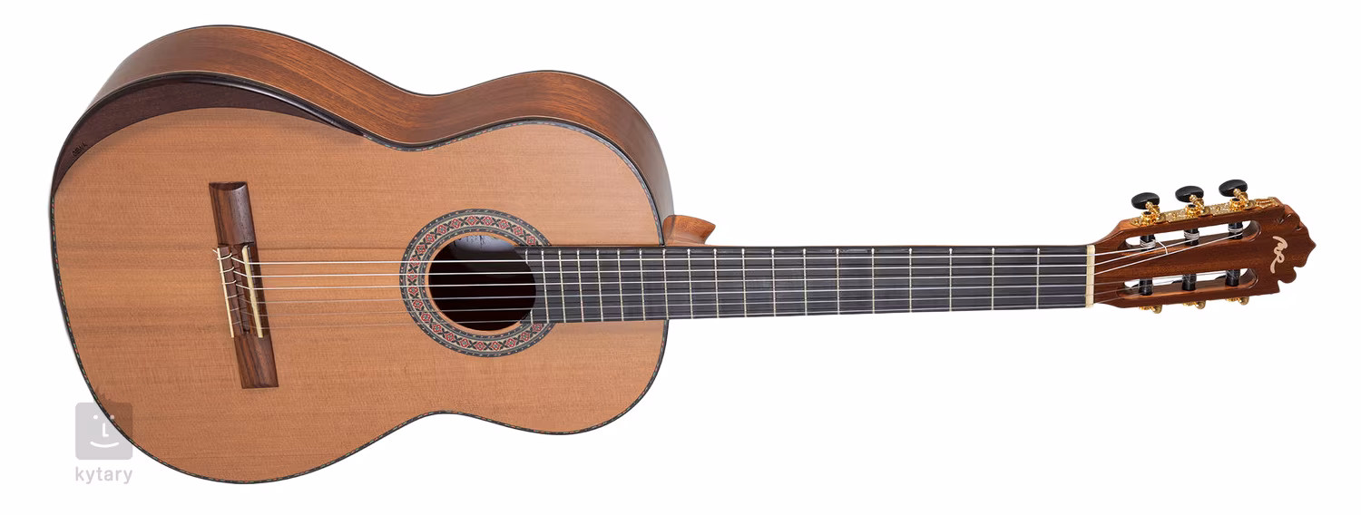 A MAGISTRAL Series all solid klasszikus gitár teljes 4/4-es méretben. A front vörös cédrusból, míg a hátlap és az oldalak mahagóniból készültek. A gitár nyaka cédrusfa nyak ébenfa merevítéssel, ébenfa fogólap, rózsafa fogólap tizenkét lyukkal, csont fogólap, aranyozott lírai mechanika fekete fogantyúkkal, praktikus kartámasz a játék kényelmének növelése érdekében, valamint hagyományos jegyek a fa test intarzia és a díszes rozetta formájában.