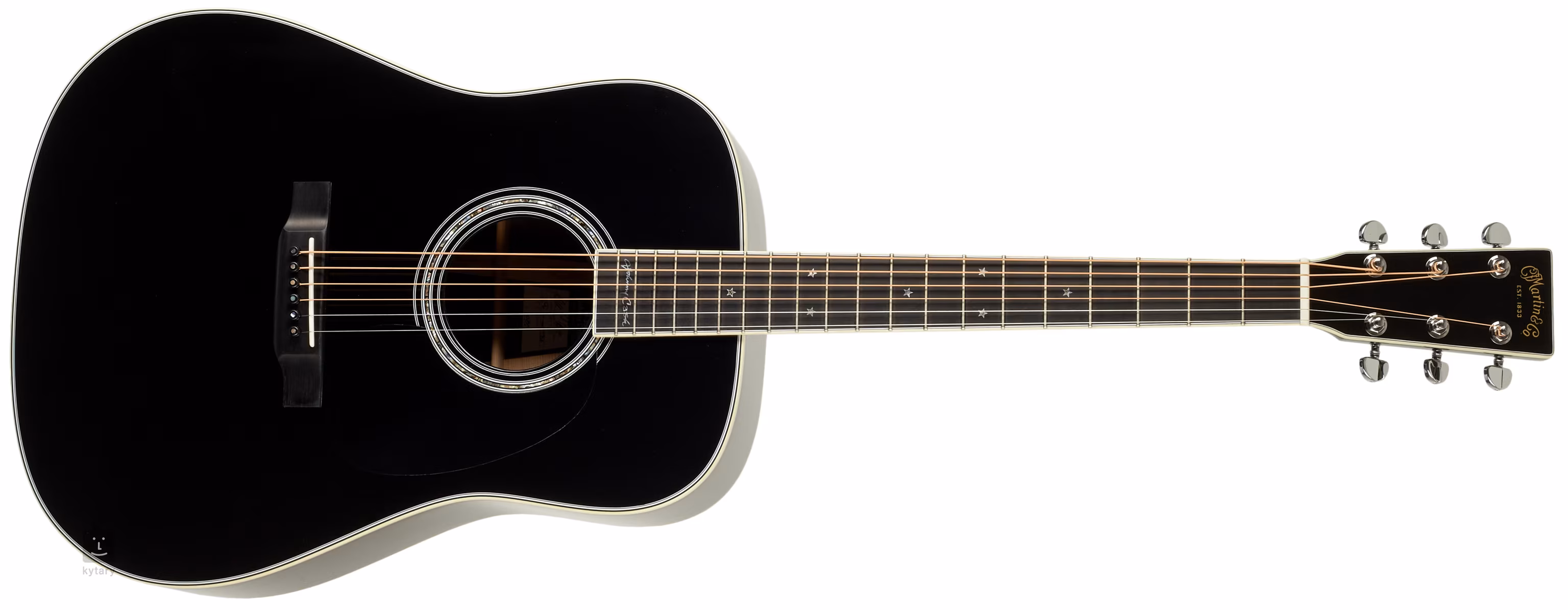 A Martin D-35 akusztikus gitár a Dreadnought típusú gitárok időtálló hangzásának és kialakításának valódi megtestesítője, amely több zenei műfajban is alkalmazásra talált, és évtizedek óta formálja a modern populáris zene arculatát. A D-35 Johnny Cash modell tisztelgés az egyik legnagyobb zenei legenda előtt, és egyben az első Martin gitár, amely fényes fekete bevonattal rendelkezik, és amely hosszú évekig stílusosan kísérte a „fekete ruhás férfit”. A gitár tokban kerül forgalomba, így azonnal készen áll arra, hogy autóval vagy kisteherautóval hosszú vagy rövid utakra induljon zenei álmai megvalósítása felé. A gitár elülső lapja Engelmann fenyőből, a hátsó lapja és az oldala pedig kiváló kelet-indiai paliszanderből készült, a hátsó lap három részből áll. Az elülső lap rezonanciáját és a gitár általános jó akusztikai tulajdonságait egy speciális, csökkentett X típusú bordázás (Scalloped Forward-Shifted X-Brace) erősíti. A válogatott keményfából (Select Hardwood) készült nyak, amely standard módon a 14. fekvenél csatlakozik a testhez, 20 fekvenel ellátott ébenfa fogólappal van bevonva. A felületen való orientációt gyöngyház (Abalone with Mother-of-Pearl) pozíciójelölők és oldalsó fekete pontok segítik. A pontos hangolást és a jó sustain-t a kompenzált nyereg és a csontból készült nulladik fekvés, valamint a krómozott mechanika és az ébenfa húrtartó biztosítja. A hangszer stílusos megjelenését hangsúlyozza a test, a fogólap és a fej imitált elefántcsontból készült szegélye, a hátsó lap díszítő betétje (zig-zag), a gyöngyház rozetta, a fej paliszander furnérja a stilizált Martin logóval és a fekete pickguard, amely egyben védi a gitár lakkját a karcolásoktól. Az 1833-ban alapított amerikai Martin cég méltán tartozik a legnagyobb és legelismertebb nevek közé a húros hangszerek területén. Évtizedek óta a gitárgyártás terén a konstrukciós megoldások és technológiai eljárások terén az egyik vezető innovátor. Azonban nagy hiba lenne csak a múlt időt használni; a Martin logóval ellátott hangszerek ma is a legmagasabb minőséget garantálják a kivitelezés és a hangzás terén. Jelenlegi termékeik emellett „környezetbarát” alkatrészeket használnak, amelyek megújuló forrásokból és kompozit anyagokból készülnek.