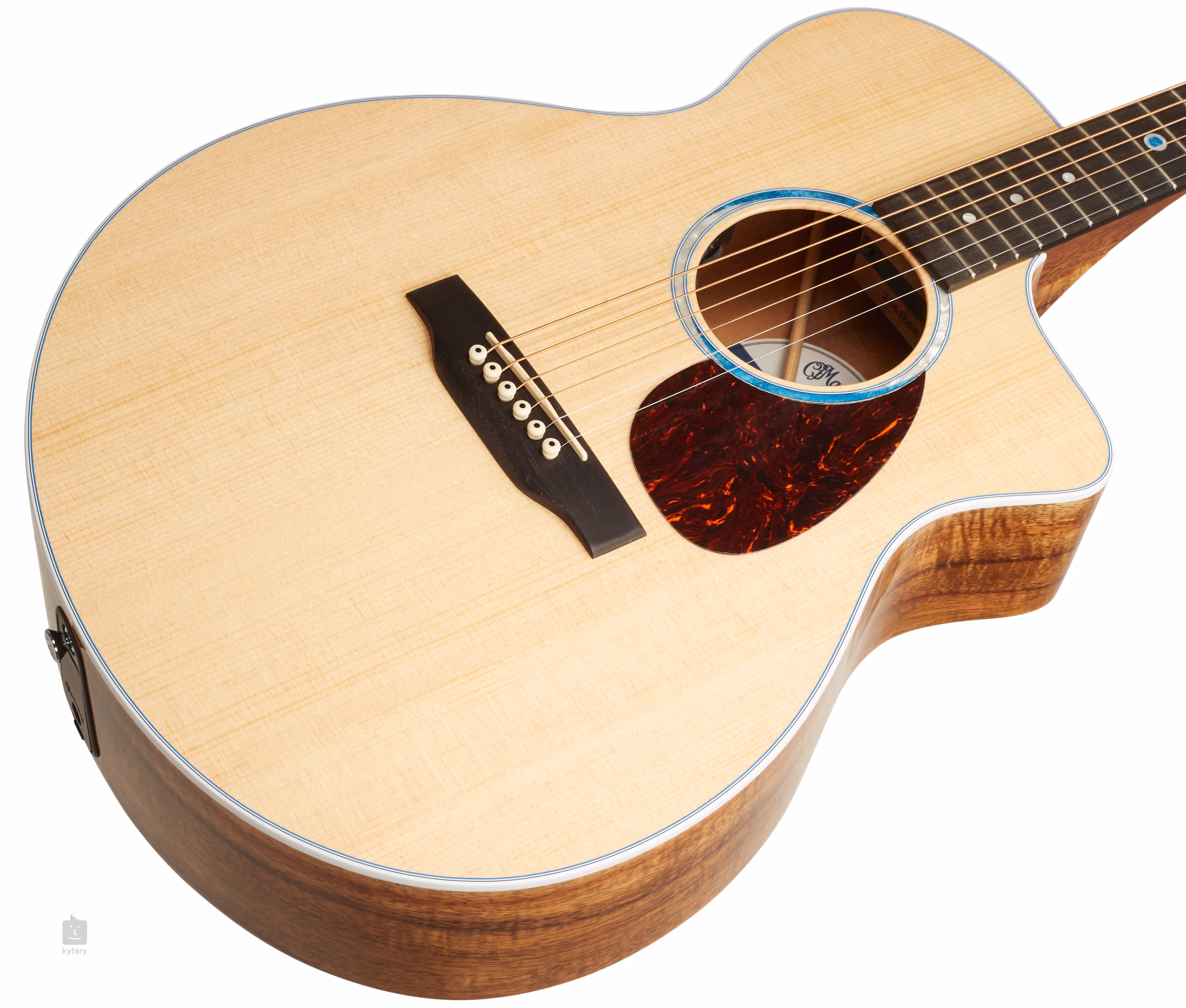 Az ébenfa fogólapra helyezett TUSQ kompozit nyereg a Corian fogólappal együtt kiváló rezonanciát és tartást biztosít a húroknak. A hangszer vonzó megjelenését a gyöngyház rózetta, a fehér kötés kék és fehér vonalakkal, a gyöngyház markerek és a teknőspáncél utánzatból készült pengetővédő hangsúlyozza, amely a gitár lakkját is védi a karcolásoktól.