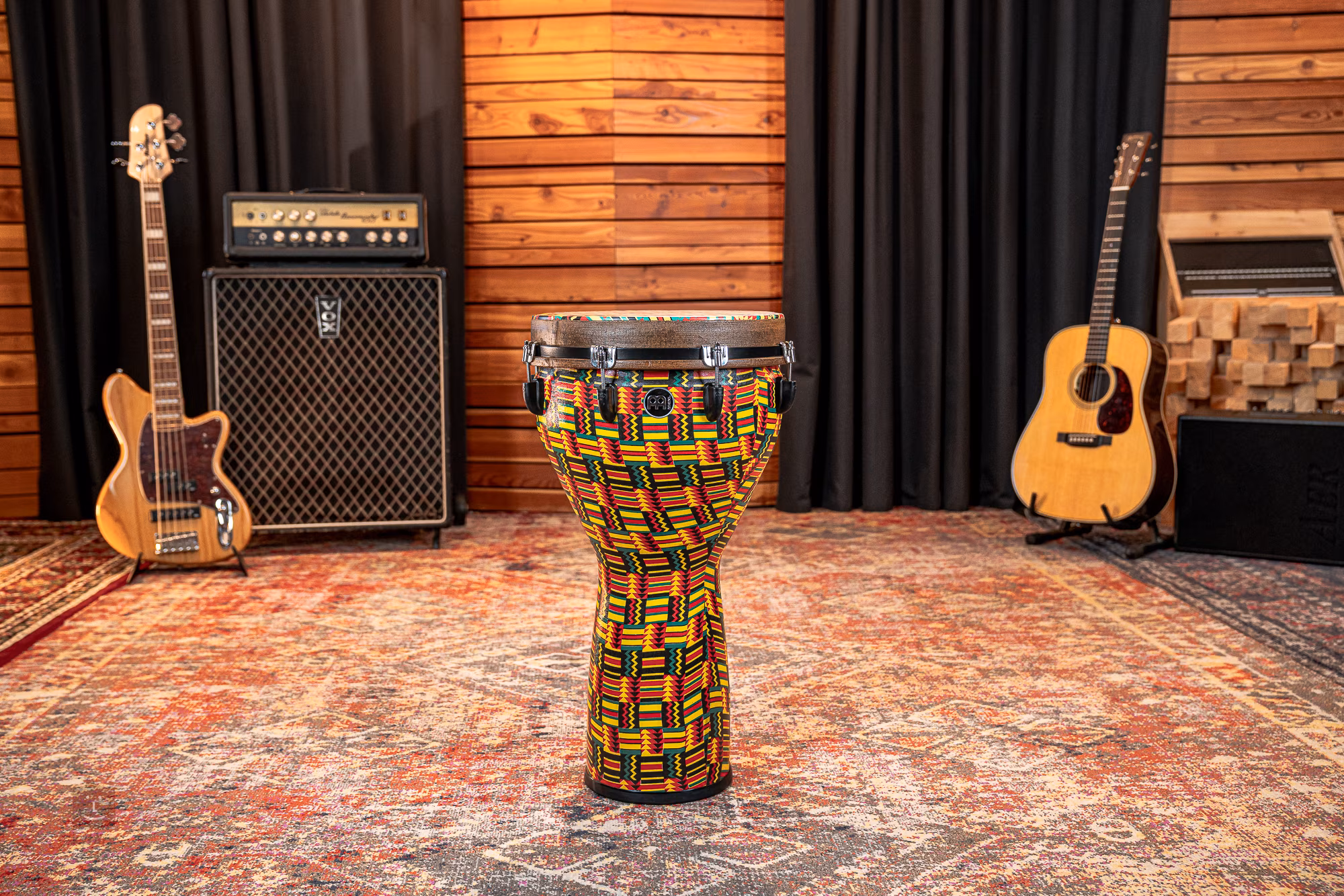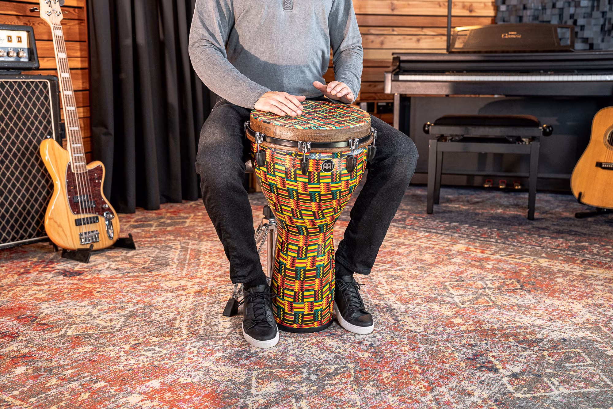 Ha egy igazán jó minőségű, erőteljes hangzású djembe-t keres, amely tartósságának és könnyű súlyának köszönhetően ideális a gyakori utazáshoz, akkor a legjobb helyen jár. Ez a Meinl Jumbo sorozatába tartozó djembe könnyű szintetikus anyagból készült, amely nemcsak nagyon tartós és teljesen időjárásálló, hanem a hangszer hangzási lehetőségeinek igen széles skáláját is biztosítja. Ezt segíti a nagyobb test is, amely a jobb rezonancia képességének köszönhetően igazán vastag basszus hangzást, de éles és koncentrált magas vagy slap hangokat is képes produkálni. A stabil és könnyű hangolást a robusztus hardver biztosítja, amely egyúttal egyenletes hangzást is biztosít. Ez a modell stílusos kivitelezéssel is rendelkezik, amely biztosan nem marad észrevétlen.