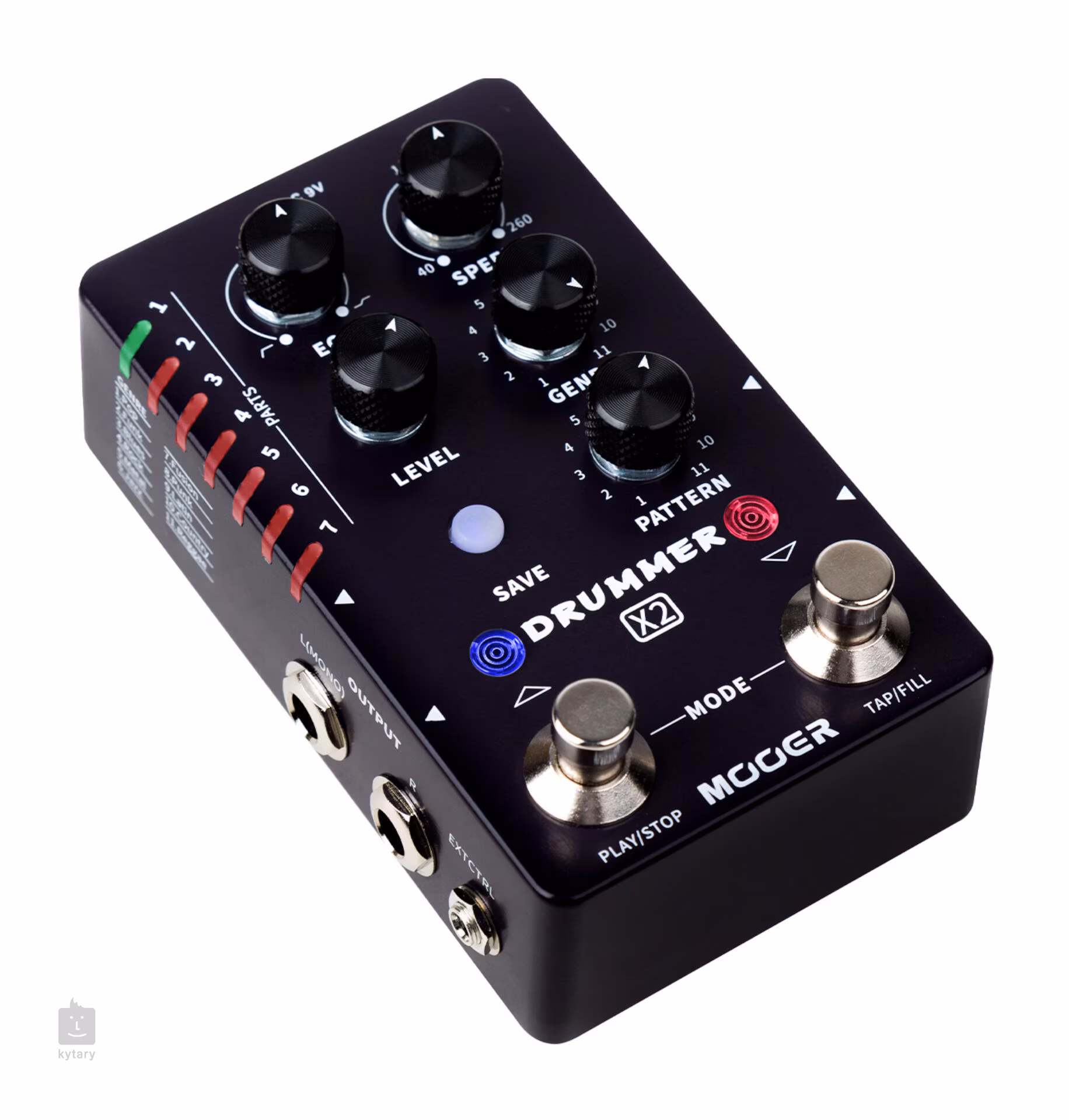 A Mooer Drummer X2 egy nagy teljesítményű dobgép pedál formájában, amely realisztikus és teljesen testre szabható ritmusokat biztosít gitárosok és más zenészek számára. 121 különböző dobgroove-ot kínál 11 zenei műfajba sorolva, és minden műfaj 11 ritmusvariációt tartalmaz. Ez a pedál ideális egyéni gyakorláshoz és élő fellépésekhez is, ahol megbízható dobkísérőként szolgálhat.