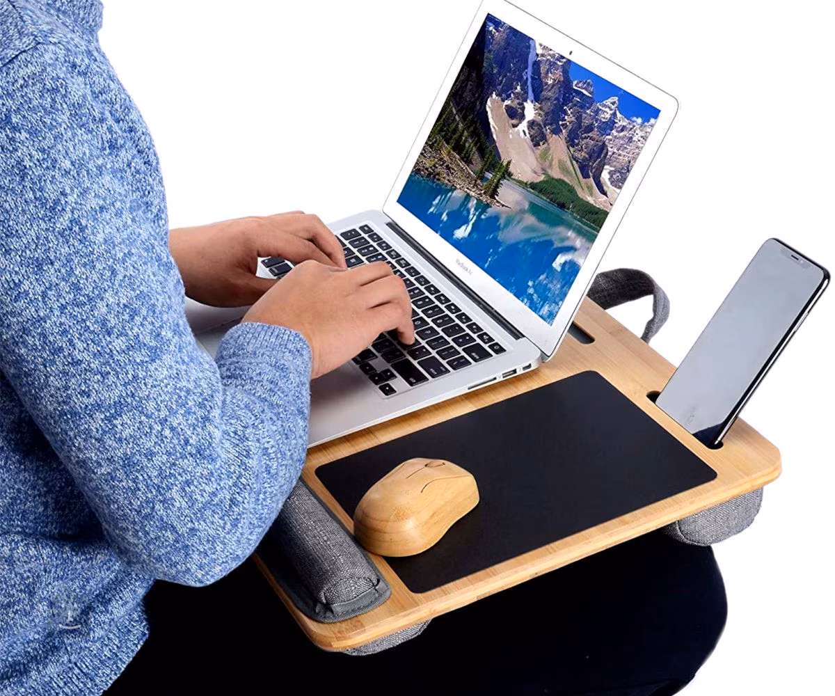 Univerzális bambusz munkaszőnyeg divattervezők, grafikusok és más kreatívok számára, akiknek maximális kényelemre van szükségük a munkájukhoz. A hátoldalon puha párnázással és csúszásmentes felülettel rendelkezik, és ugyanez a párnázás található elöl a könyöknél is. Az elülső oldalon két kivágás is található egy tablet vagy okostelefon számára, valamint egy csúszásmentes egérpad.
