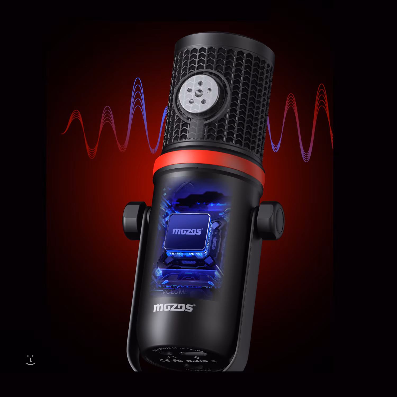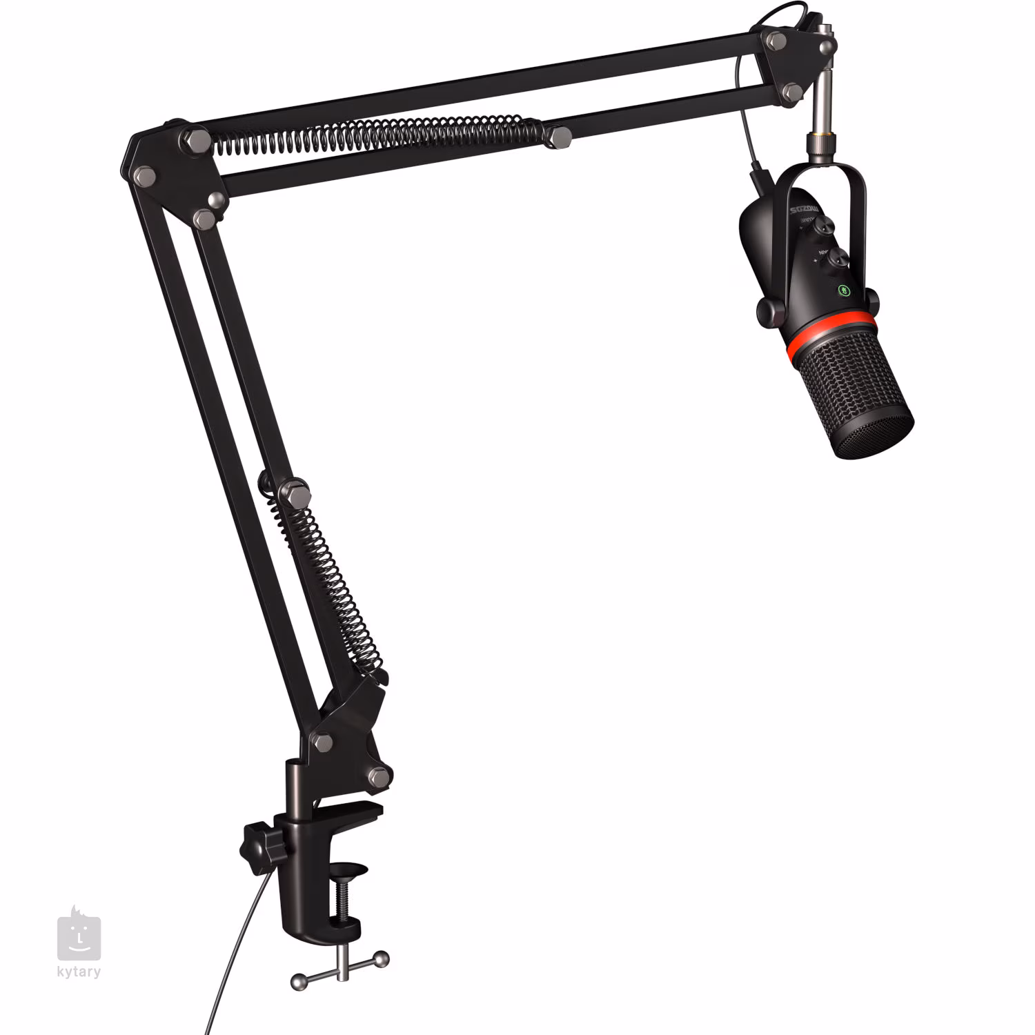A készlet tartalmaz továbbá egy állítható karú asztali mikrofonállványt, popszűrőt, párnázott mikrofontartót és USB-kábelt a számítógéphez vagy laptophoz való csatlakozáshoz.