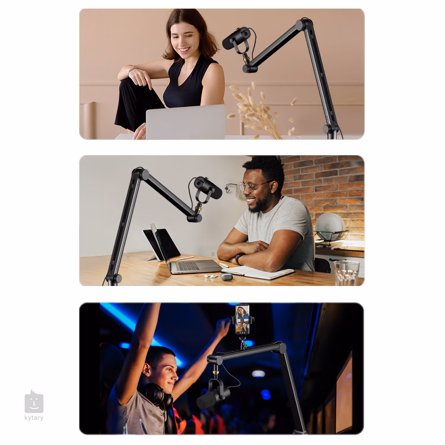 A kar széles körű kompatibilitást biztosít számos mikrofonnal. Egyáltalán nem számít, hogy egy alap mikrofonról vagy egy professzionális stúdiómikrofonról van szó. A kompatibilitás mindkét szabványos menettel biztosítja a gyors és egyszerű felszerelést. A szilikon rögzítőbetétek megvédik az asztalát a karcolásoktól, és minimalizálják az asztalról átvitt rezgéseket.