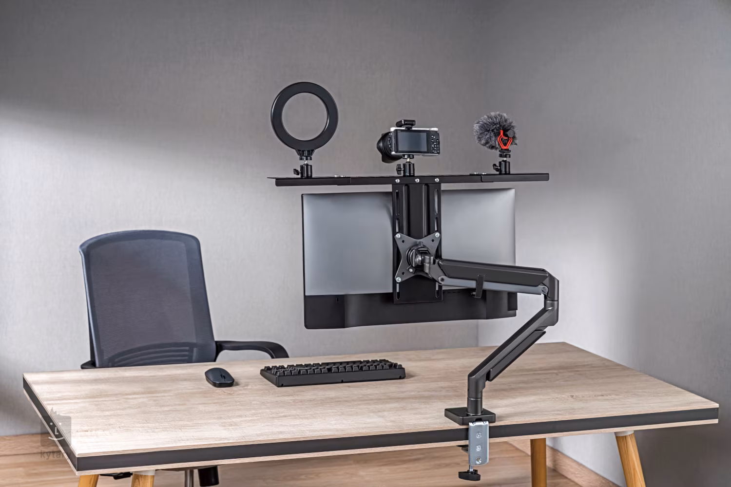 A Mozos VS1-L egy praktikus polcegység, amely funkcionális kialakítású az LCD-monitor fölé szerelhető különböző tartozékok elhelyezésére. Ez a kialakítás segít rendben és szervezetten tartani a munkaterületet, és kényelmet biztosít a videokonferenciák és az élő közvetítés számára. Ideális azon felhasználók számára, akiknek további helyre van szükségük a kamerák, mikrofonok, világítás és egyéb kiegészítők felszereléséhez.