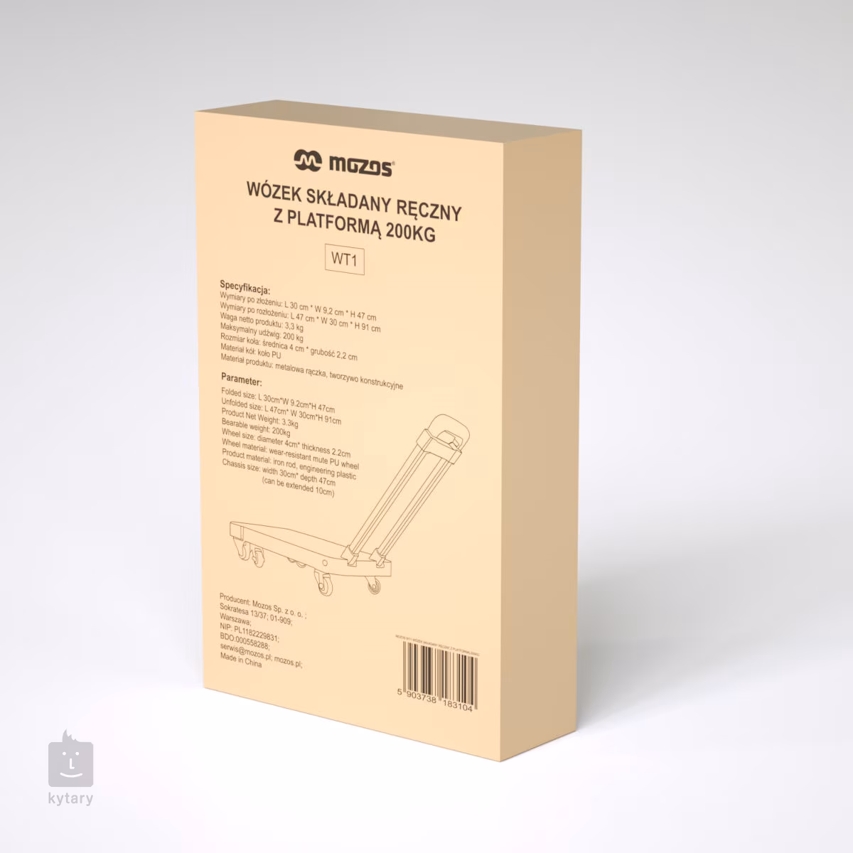A Mozos WT1 egy kompakt, összecsukható kialakítású szállító kocsi, amely viszonylag kis méreteihez (57 x 30 cm) képest 200 kg-os teherbírással rendelkezik. Ez megkönnyíti a rakomány - dobozok, ládák és nehezebb berendezések, például hűtőszekrények vagy mosógépek - szállítását a személygépkocsiból vagy furgonból. A kocsi műanyagból készült, a beépített fogantyú fém. A kocsi hossza és a fogantyú magassága állítható. A poliuretán görgők 360 fokban forognak (a tengely körül). A kocsi méretei összecsukott állapotban 47 cm x 30 cm, a görgők átmérője 4 cm.