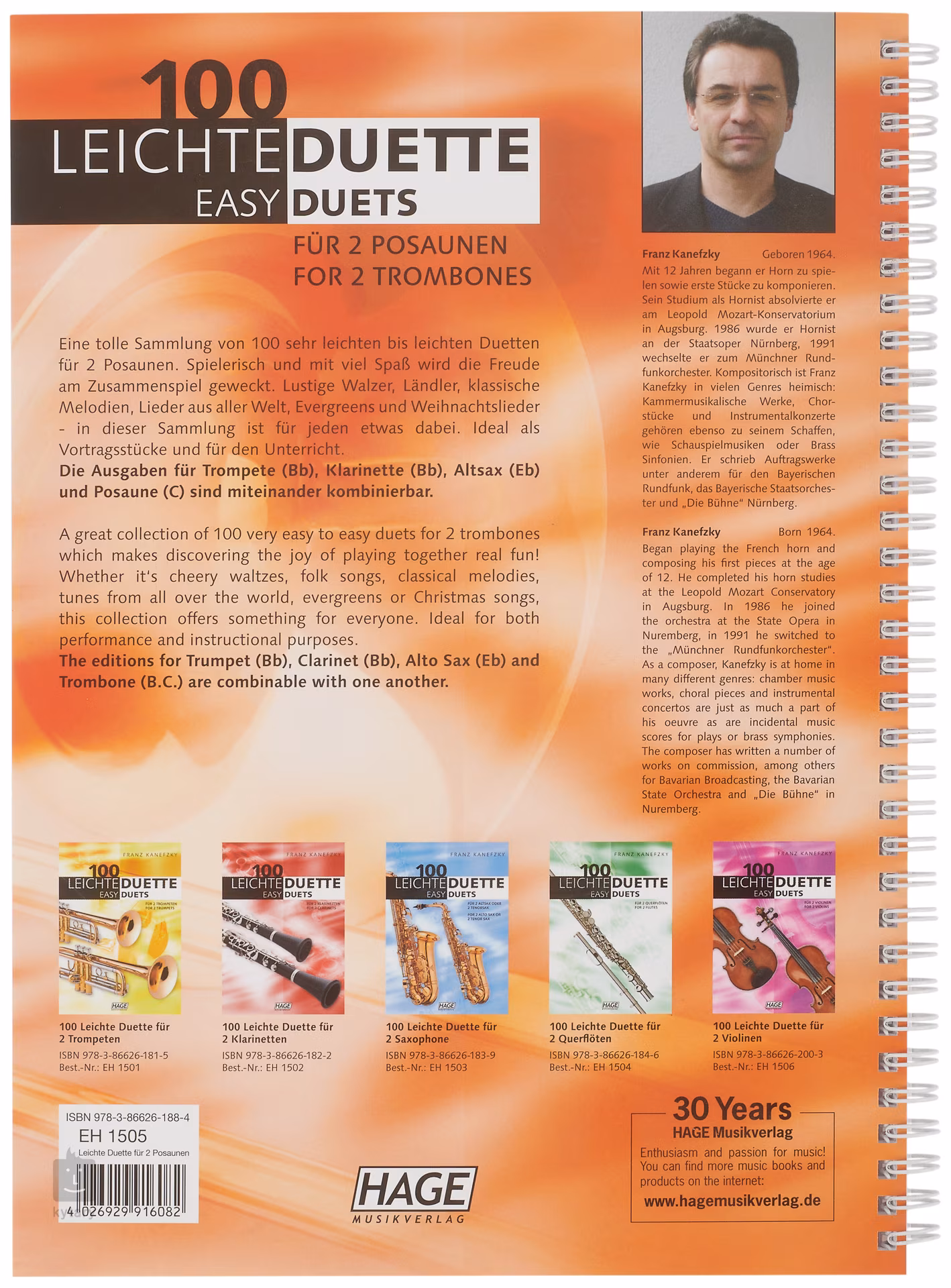 Ez a kiadvány 100 duettből álló válogatást tartalmaz két harsonára könnyed hangszerelésben. Keringők, népdalok, klasszikus zenei dallamok, örökzöldek a világ minden tájáról és karácsonyi dalok/karácsonyi énekek - mindenki számára van valami. A darabok feldolgozásai alkalmasak a tanórák gazdagítására és előadásra.