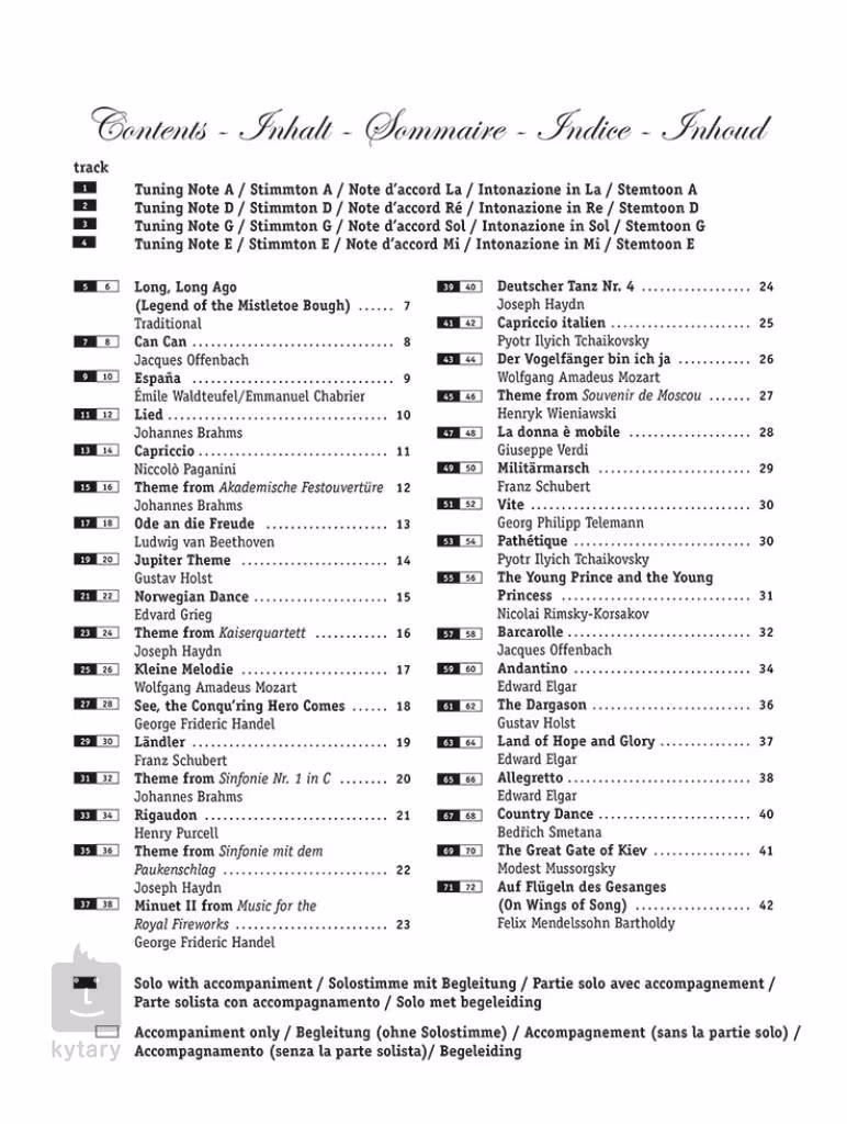 A Klasszikus darabok kiadvány olyan híres zeneszerzők gyönyörű hegedűdarabjait tartalmazza, mint Georg Philipp Telemann, Wolfgang Amadeus Mozart, Franz Schubert és Edvard Grieg. Ezek egyszerű darabok (könnyű szint), amelyek alkalmasak a hegedűkönyvek kiegészítésére. A könyvben zongorakíséretek is szerepelnek, és hozzáférést biztosítunk az online hanganyaghoz, ahol a felsorolt darabok összes play-along változatát megtalálod.