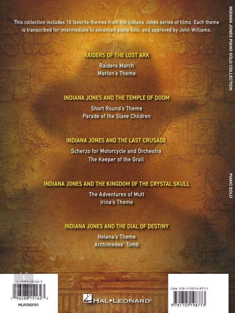 Készüljön fel egy kalandos utazásra a zongora billentyűzetén keresztül az Indiana Jones Piano Solo Collectionvel, amely az Indiana Jones filmsorozat tíz kedvenc dallamát tartalmazza. Minden téma egy-egy, maga John Williams által jóváhagyott, szólózongorára (haladó és haladóbb szintre) kidolgozott feldolgozásban.