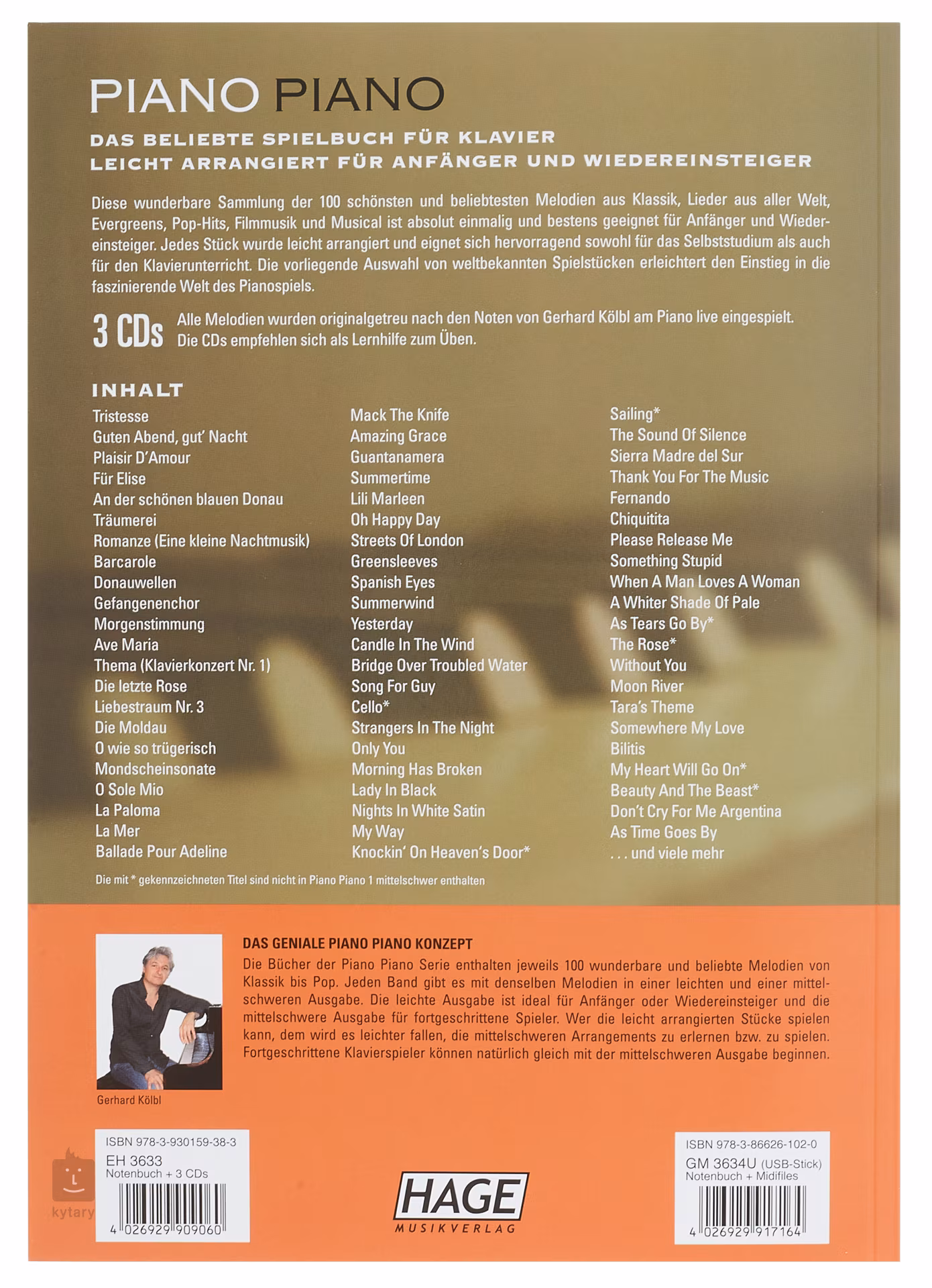 A Piano Piano 1 easy című kiadvány 100 darabot kínál klasszikus, népzenei, könnyűzenei, valamint ismert film- és musical-dallamokból válogatva, egyszerű zongoraművészeti feldolgozásokban. Az egyszerű hangszerelésnek köszönhetően a darabok kezdő zongoristák számára is alkalmasak - önálló tanulásra és a zeneiskolai órák változatosabbá tételére.