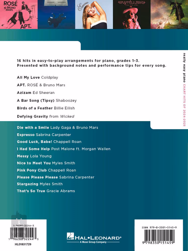 Játsszon népszerű slágereket 2024-2025-ből a zongoráján, mielőtt a por leülepszik rájuk. A kiadvány Really Easy Piano: Chart Hits of 2024-2025 című kiadvány a világot megmozgató slágereket kínálja egyszerű feldolgozásokban zongorára, amelyekkel még a kezdő játékosok is megbirkóznak. A darabokat rövid szöveg kíséri játéktippekkel és magukkal a darabokkal kapcsolatos információkkal (zeneszerző, háttér).