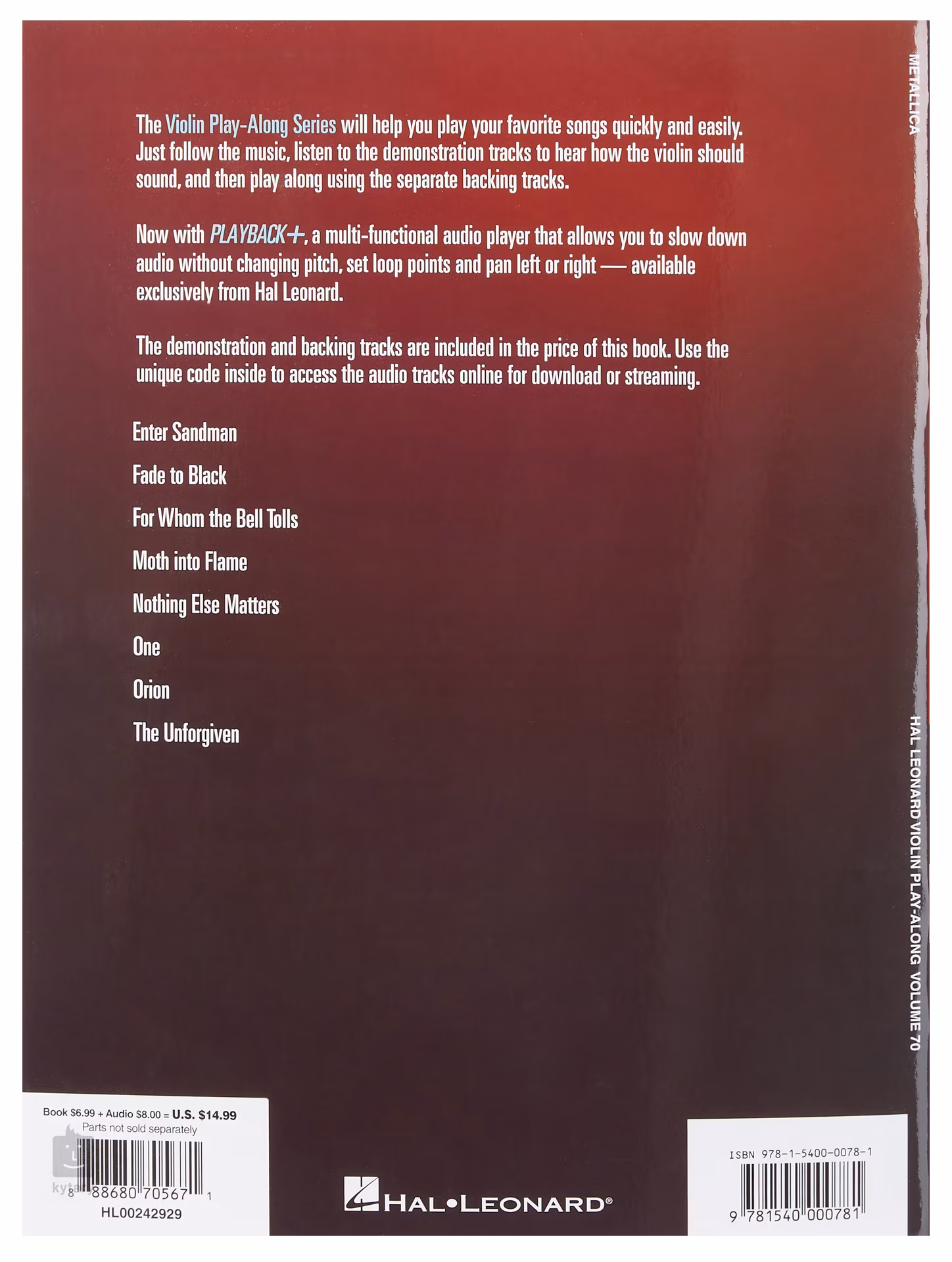 Ez a kiadvány a Metallica nyolc leghíresebb slágerét kínálja hegedűre hangszerelve. A kiadvány hozzáférést tartalmaz online hangsávokhoz, amelyeket a jobb látvány érdekében lelassíthatsz a hangolás megváltoztatása nélkül, vagy loop-olhatsz.