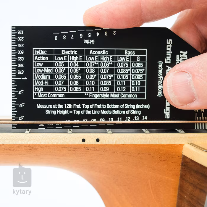Ez a húrmagasságmérő eszköz egyesíti a pontosságot, a minőséget és a funkcionalitást, hogy hangszerének pontos beállítása nagyon egyszerű és gyors legyen. A szerszám prémium rozsdamentes acélból készült, fekete kivitelben, jellegzetes fehér színű, maratott jelölésekkel és számokkal. Ez tiszta kontrasztot biztosít, és évekig tartó használat után is nagyszerű olvashatóságot biztosít. A szerszámon metrikus és angolszász mértékrendszereket is talál, valamint egy praktikus és áttekinthető táblázatot a különböző szerszámokhoz ideális méretekkel. A hangszedők magasságának beállításához vonalzóval is rendelkezik, illetve különböző hosszúságú oldalakkal a megfelelő bundmagasság ellenőrzéséhez.