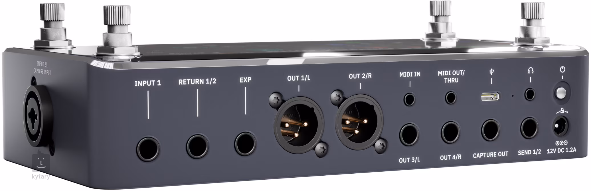1x Input 1 (6,3 mm jack TS), 1x Input 2 (kombi XLR/6,3 mm jack TRS), 1x Return (6,3 mm jack TRS), 1x Expression (6,3 mm jack TRS), 1x MIDI IN, 1x USB-C
