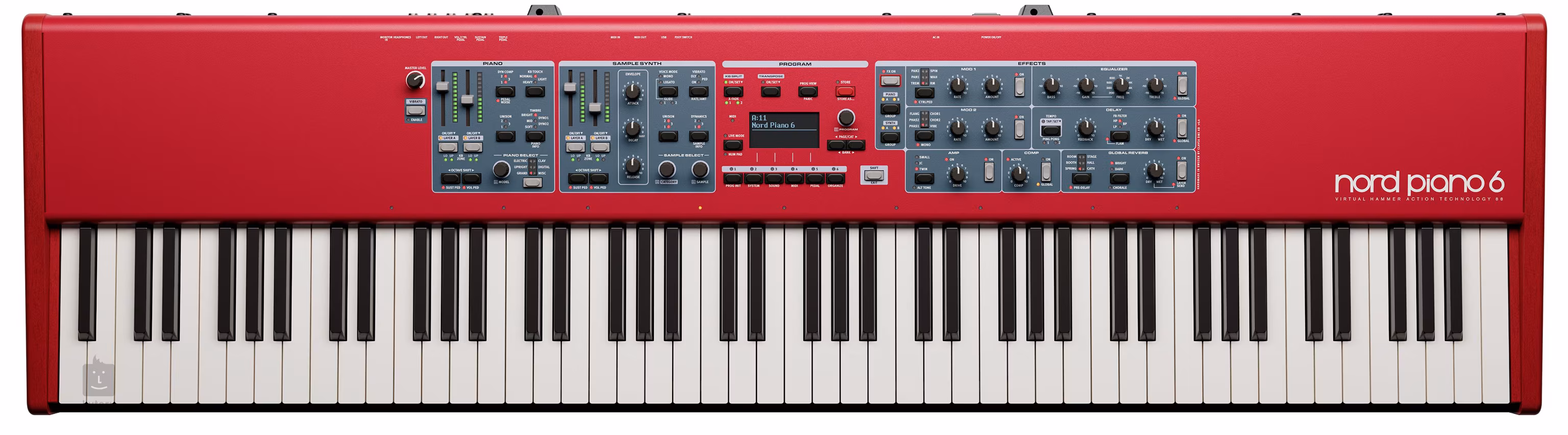 A Nord Piano sorozat legújabb generációja továbbfejlesztett kezelőpanellel rendelkezik, amelyet LED-jelzésű faderek uralnak, két hangréteggel a Piano és a Synth számára, beleértve a független effektbeállításokat, valamint egy prémium minőségű Triple Sensor billentyűzettel. A hordozhatóság és a kiváló hangzásbeli jellemzők kombinációja a Nord Piano 6-ot egy rendkívül rugalmas hangszerré teszi az élő előadáshoz és a stúdióhangzáshoz. Mit nyújt még a Nord Piano új generációja? Például korszerű OLED kijelzőt, teljesen zökkenőmentes átmenetet az előbeállítások között, 16 bank 36 programmal és szervezési lehetőségekkel, Live módot 6 programmal, globális és program transzponálást +/- 6 félhanggal, finomhangolási lehetőségeket, választható split pontokat LED jelzéssel (akár 9 helyen) és természetesen MIDI támogatást USB-n keresztül.
